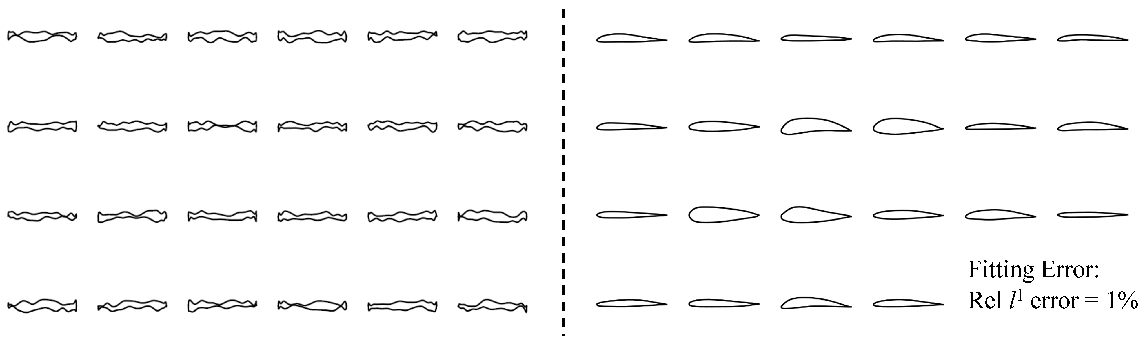 | Airfoil design, BSplineGAN | 1552 UIUC airfoils | 252 → 26 | error = 1% | Du et al. [91] |