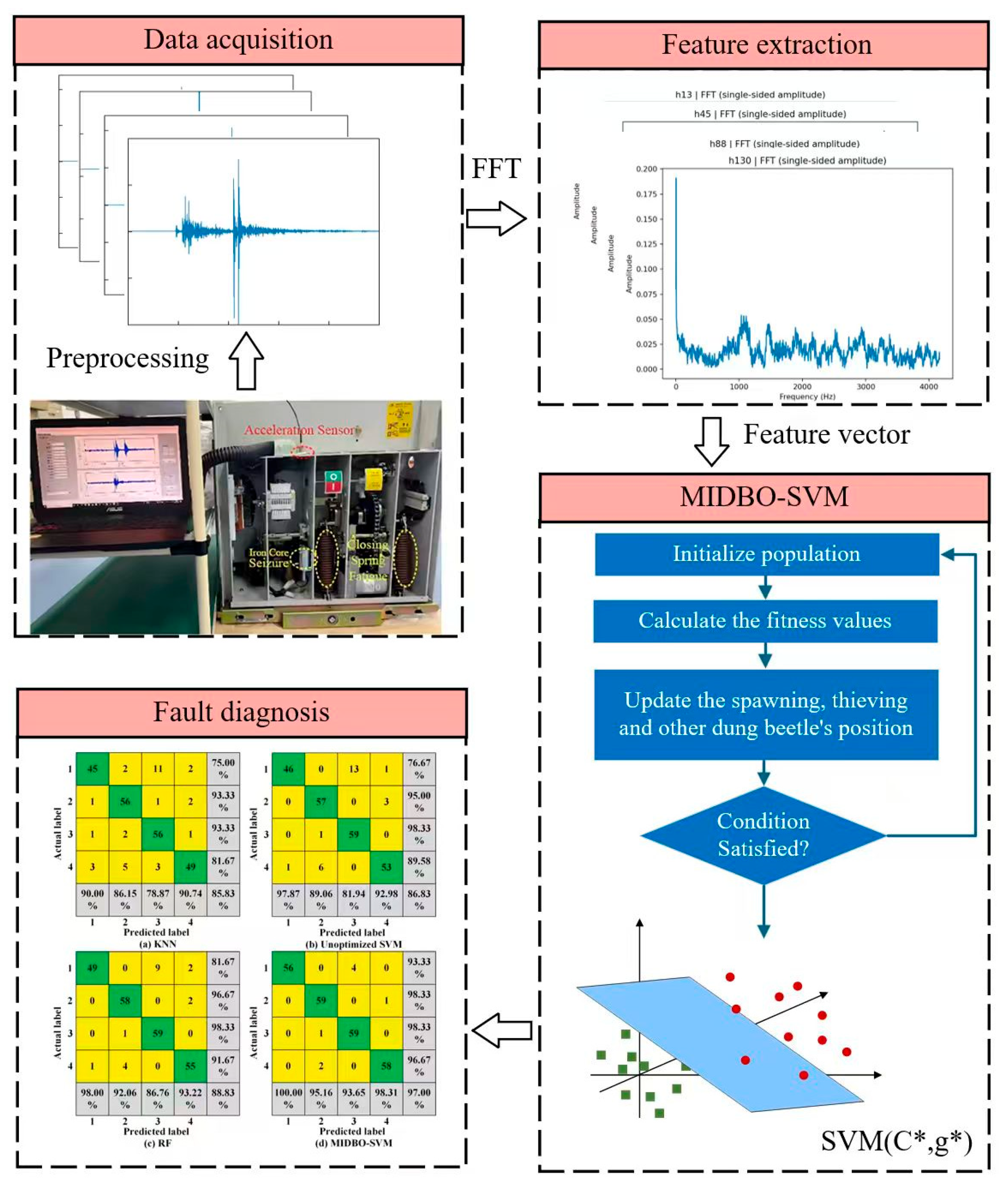 Figure 1, this process completes the full diagnostic pipeline, from signal acquisition and feature extraction to intelligent optimization and fault decision-making. By tightly coupling MIDBO with SVM parameter tuning, the proposed method significantly enhances classification accuracy, convergence stability, and robustness under unbalanced sample conditions, thereby providing a reliable and efficient solution for mechanical fault diagnosis of HVCBs.