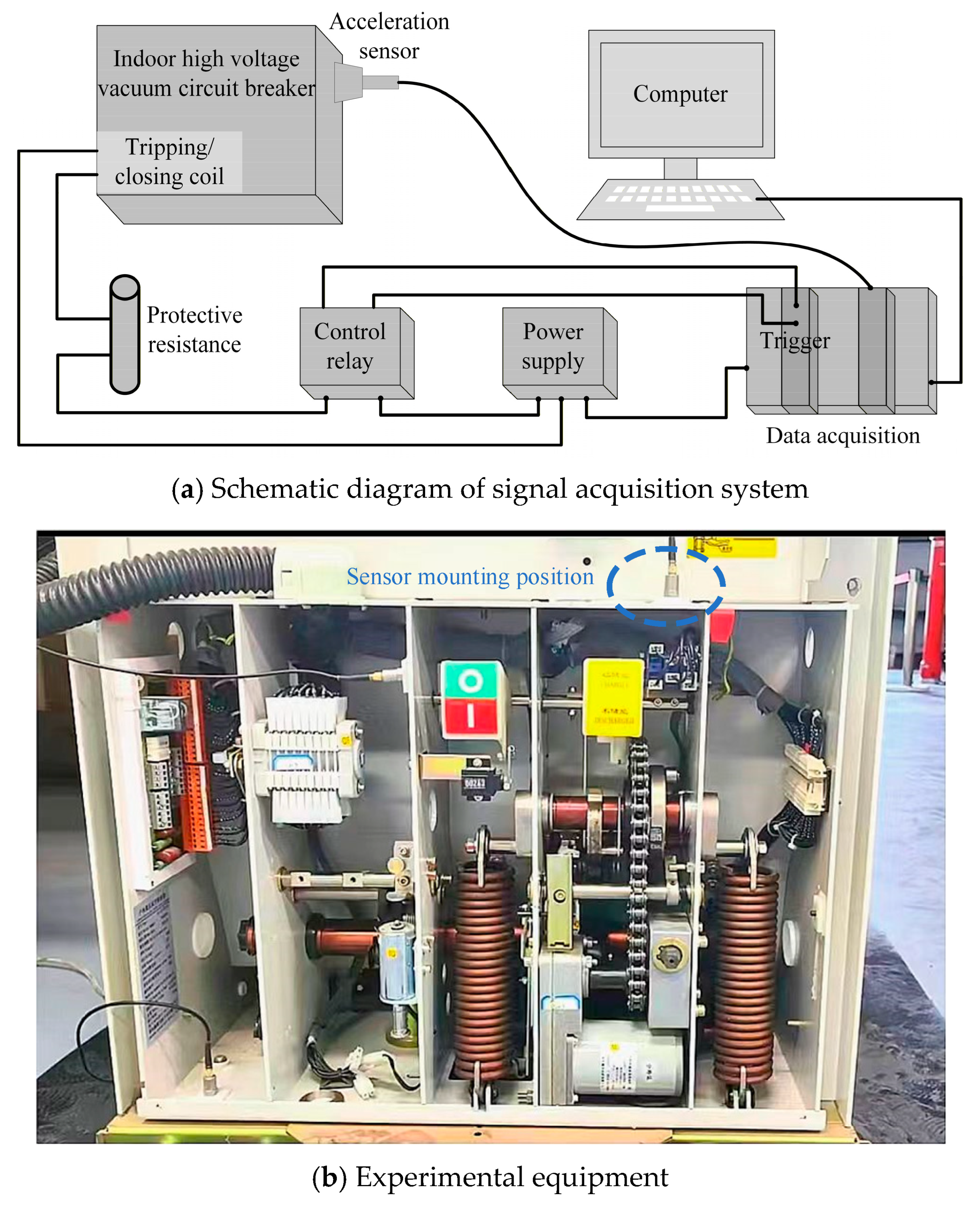 To evaluate the effectiveness and engineering applicability of the proposed MIDBO–SVM fault diagnosis method, an experimental fault simulation platform was established using a VS1 HVCB as the test object. The training and testing datasets were obtained by simulating typical operating conditions and representative mechanical fault scenarios. The schematic diagram and physical configuration of the data acquisition system are shown in