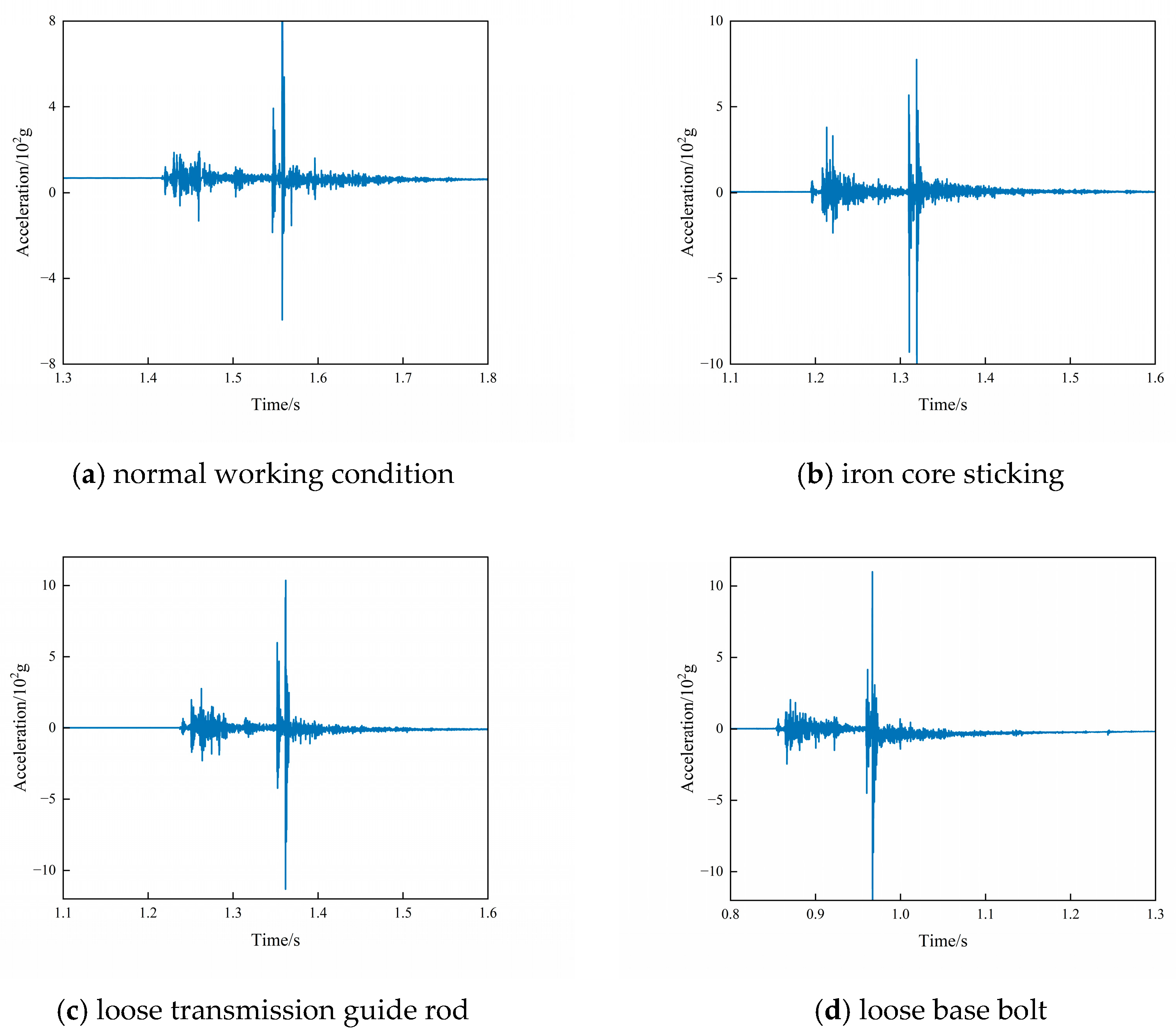 3]. Factors such as spring fatigue, iron core jamming, and coil degradation during switching operations may lead to malfunction, potentially causing severe disturbances or even cascading failures in the power system. Mechanical vibration signals generated during HVCB operation contain abundant condition-related information, including action timing, amplitude, and frequency characteristics, which reflect the health status of mechanical components. In particular, vibration signals with a high signal-to-noise ratio provide valuable insight into the mechanical behavior of circuit breakers [