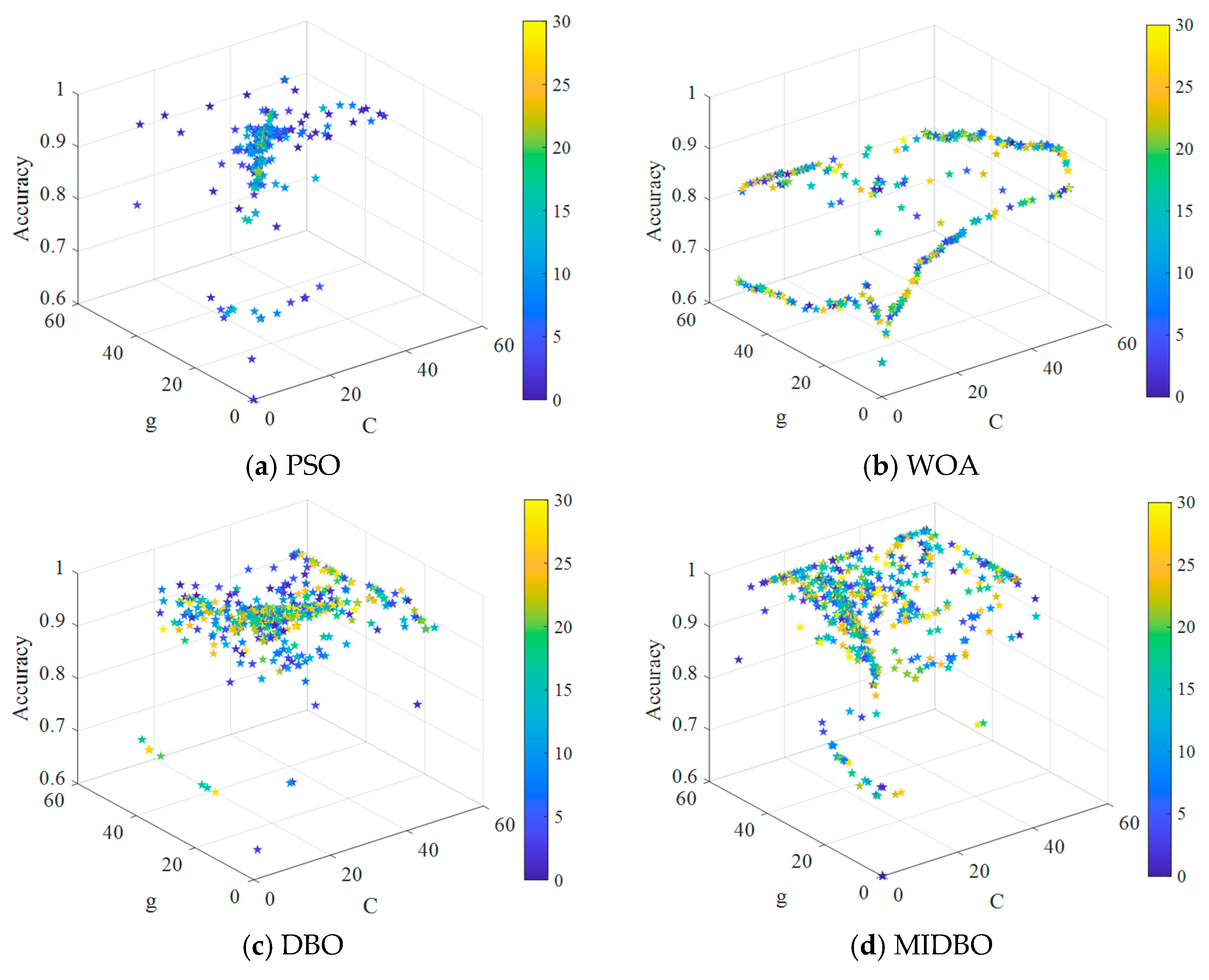 Figure 7. The whale optimization algorithm (WOA) exhibits reduced population diversity during the later stages of optimization, leading to premature convergence. Although WOA converges relatively quickly, its limited global search capability restricts further performance improvement. The PSO method shows strong stochastic behavior, with rapidly decreasing population diversity, which increases the risk of convergence to local optima. As a result, PSO–SVM often requires multiple runs to obtain satisfactory solutions and exhibits slower convergence and lower optimization accuracy. Compared with PSO and WOA, the DBO algorithm demonstrates a more uniform population distribution and improved global exploration capability. However, its local exploitation ability remains limited, which may result in convergence to suboptimal solutions. In contrast, the proposed MIDBO algorithm effectively addresses these limitations. Through improved population initialization and adaptive parameter regulation, MIDBO achieves a better balance between global exploration and local exploitation, resulting in faster convergence and improved optimization accuracy.