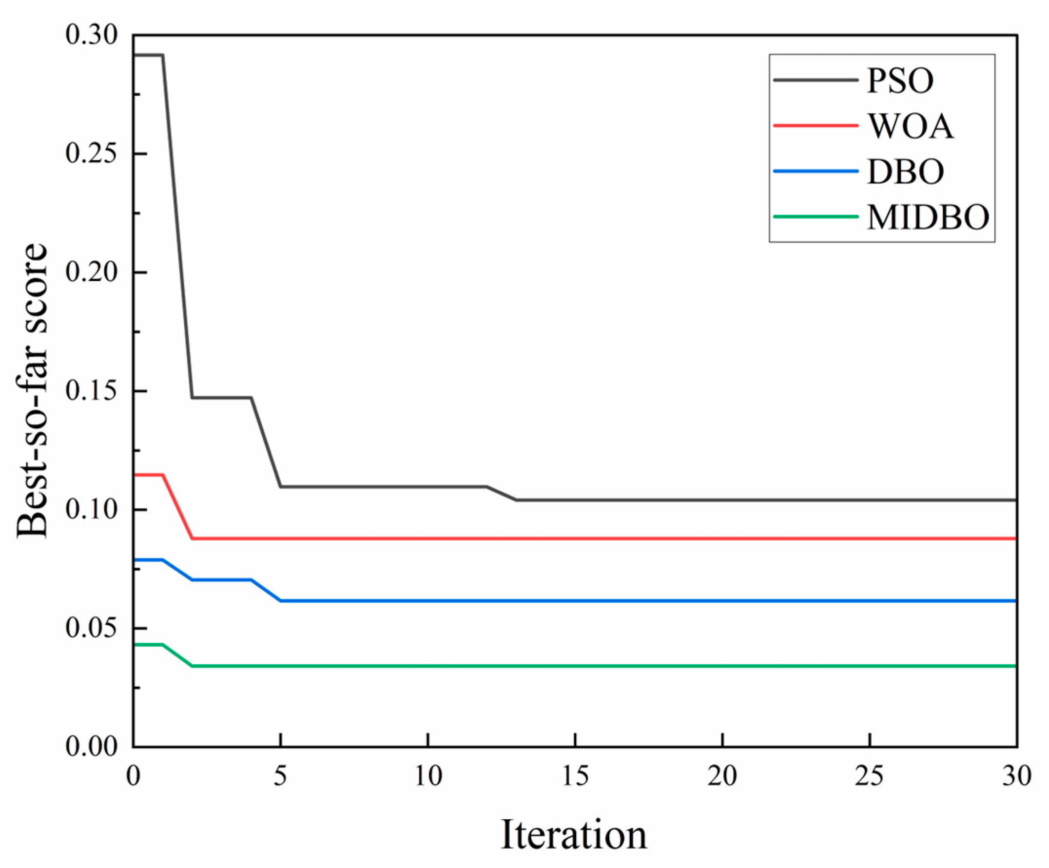 Figure 8. The PSO–SVM model exhibits stagnation during optimization and converges to an error value of 0.1042 after 14 iterations, indicating limited optimization performance. Although WOA–SVM converges faster than PSO–SVM, its final accuracy improvement is limited, suggesting insufficient local search refinement. The DBO–SVM model achieves improved convergence accuracy and speed, but its exploration and exploitation balance remains suboptimal. In contrast, the proposed MIDBO–SVM reaches an error rate of 0.0333 within only three iterations, achieving the highest convergence accuracy with the fewest iterations. This result demonstrates the effectiveness of MIDBO in improving optimization efficiency and robustness.