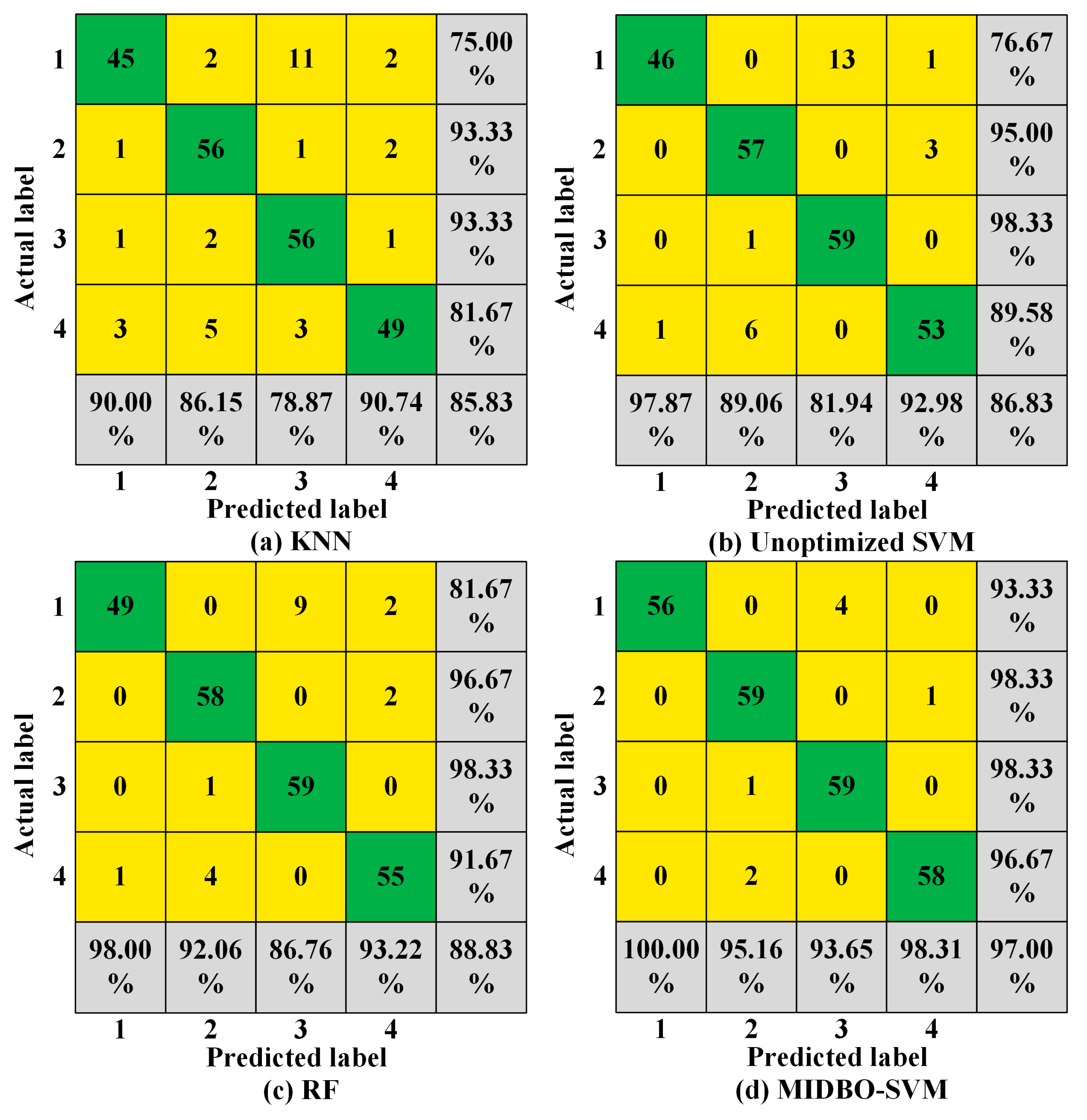 Figure 9, where Class 1 corresponds to normal operation and Class 4 represents the loose base bolt fault, which exhibits feature characteristics partially overlapping with normal conditions. The confusion matrix results reveal that conventional classifiers, particularly the unoptimized SVM and RF, tend to misclassify normal operating samples as loose base bolt faults. This misclassification arises from overlapping vibration frequency features between healthy states and early-stage mechanical looseness, leading to blurred decision boundaries. Such false alarms are highly undesirable in real-world applications, as they may trigger unnecessary maintenance actions and reduce system reliability. In contrast, the proposed MIDBO-SVM significantly reduces the misclassification of normal samples, achieving the highest true positive rate for Class 1 while simultaneously maintaining high precision for fault categories. This improvement indicates that the MIDBO-optimized SVM constructs a more discriminative and compact decision boundary, effectively separating normal conditions from fault states with similar spectral characteristics. Overall, the confusion matrix analysis confirms that MIDBO-SVM not only enhances overall diagnostic accuracy but also substantially improves reliability by minimizing false fault alarms under normal operating conditions, which is essential for practical deployment in high-voltage circuit breaker condition monitoring systems.