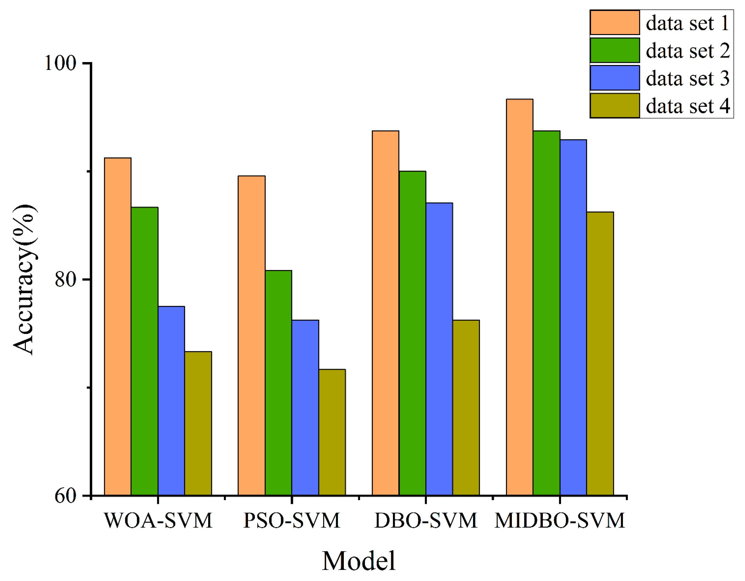Figure 11. As the degree of imbalance increases, the diagnostic accuracy of all models decreases, with PSO-SVM and WOA-SVM exhibiting particularly severe performance degradation due to their susceptibility to local optima under limited data conditions. In contrast, MIDBO-SVM consistently maintains high diagnostic accuracy, remaining above 86.25% even under severely unbalanced sample distributions. This robustness demonstrates that the optimized hyperparameters obtained by MIDBO endow the SVM classifier with strong generalization ability, making it more suitable for practical fault diagnosis scenarios characterized by limited and imbalanced data.