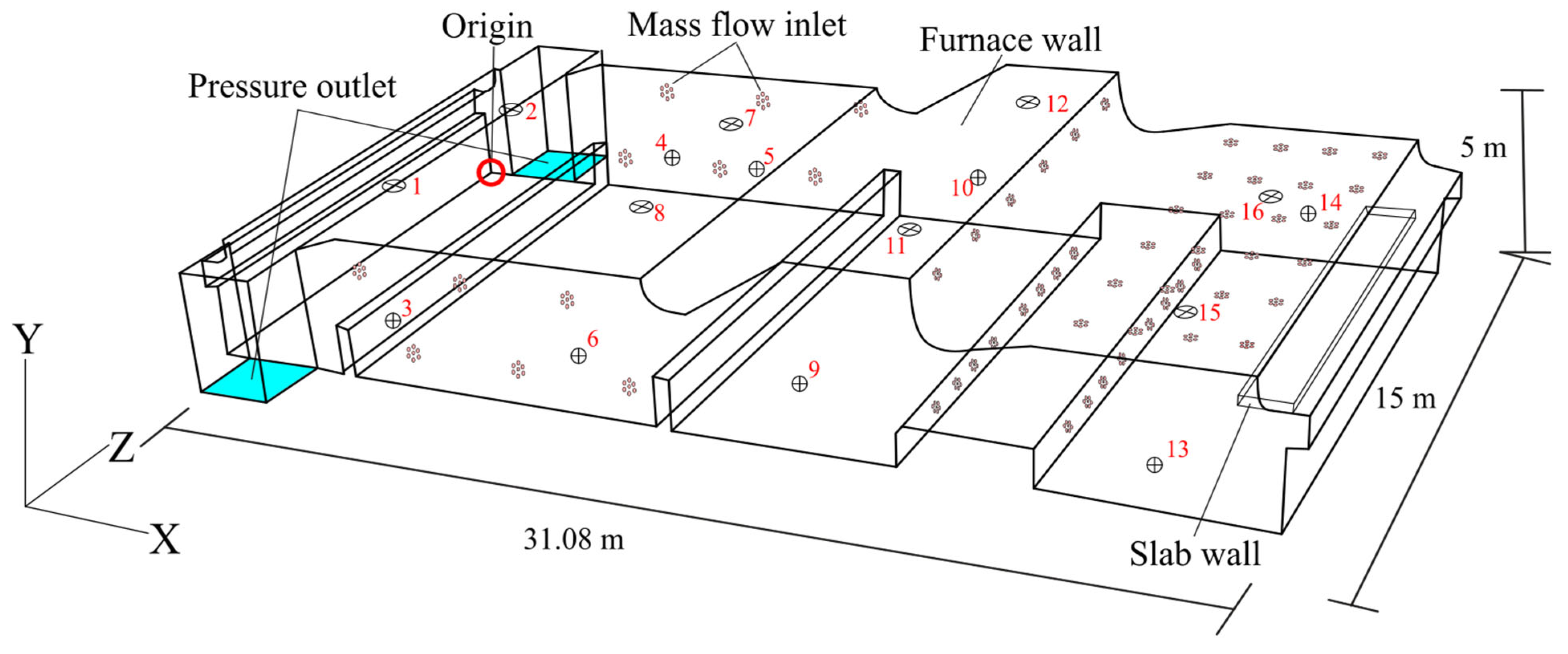 - Li, C.; Huang, Y.; Sun, J.; Ni, Y.; Lu, L. Numerical simulation of pressure distribution in a walking-beam type reheating furnace. IOP Conf. Ser. Earth Environ. Sci. 2020, 467, 012025. [Google Scholar] [CrossRef]