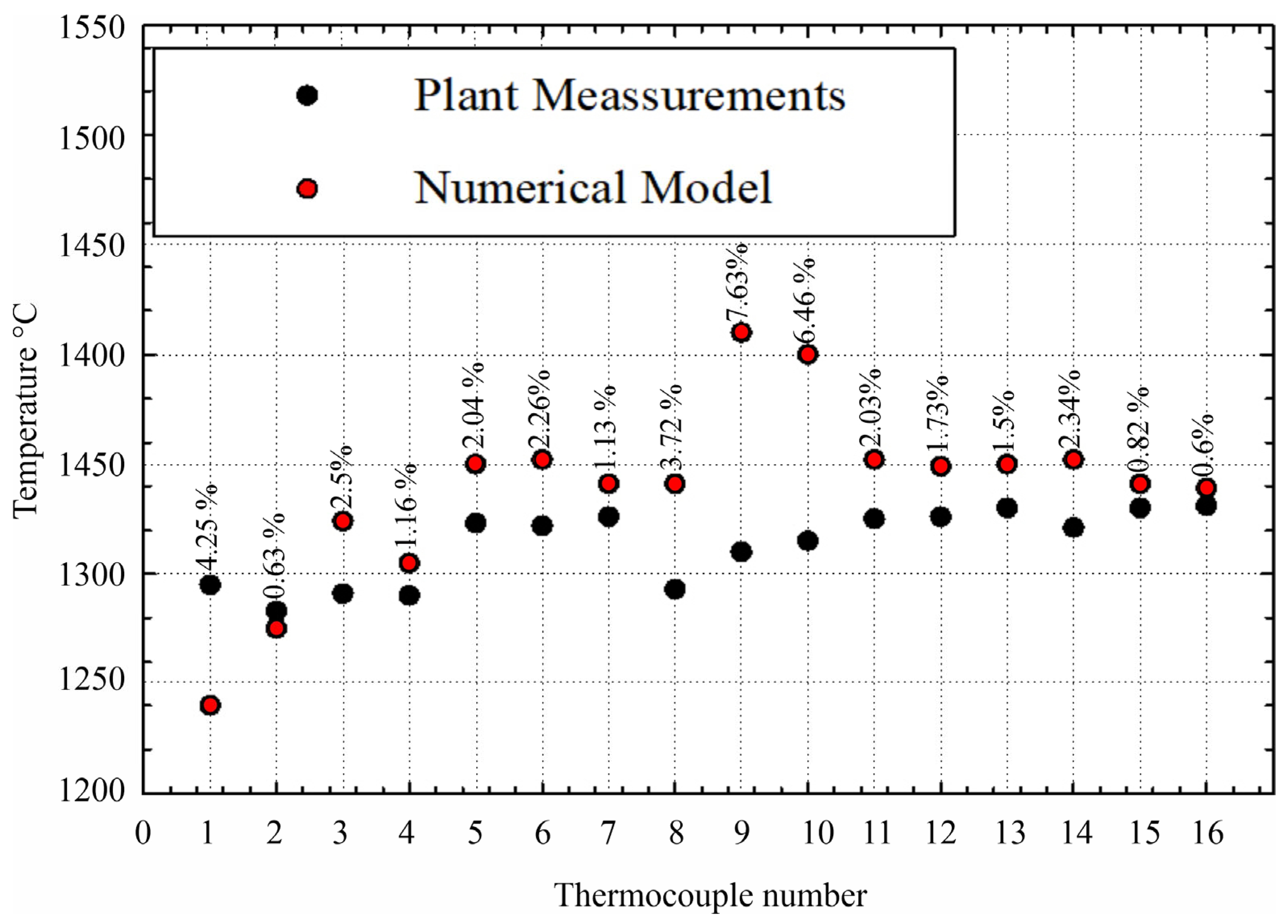 - The simulation reproduced the plant-measured temperatures with an average error of 2.5%. Adjusting the air–fuel ratio by reducing the air flow rate by 10% and standardizing the mixture at a 10:1 ratio resulted in more efficient combustion. Under these conditions, the target temperature was achieved without altering the production time, yielding significant energy savings and improved fuel consumption management.