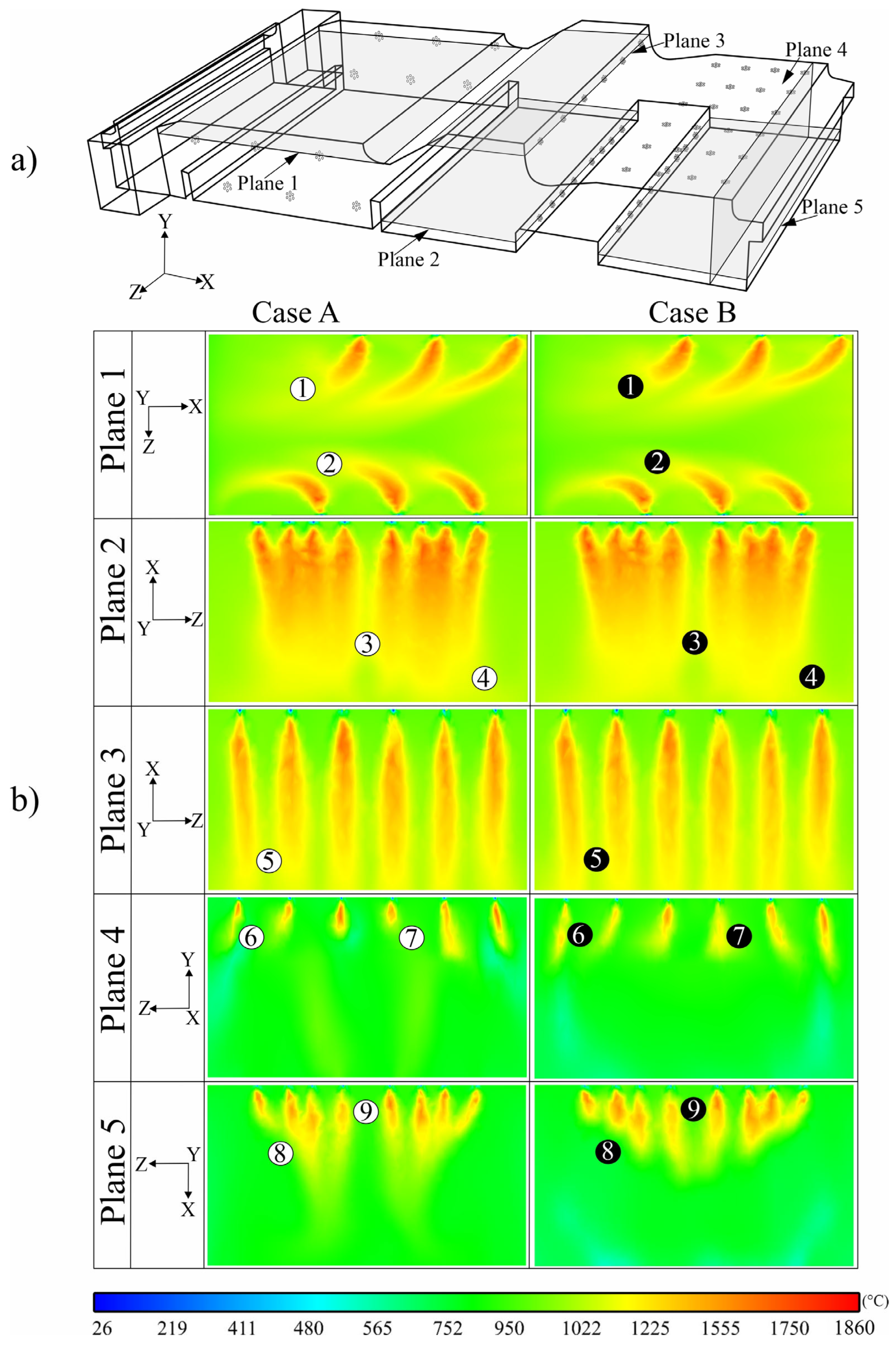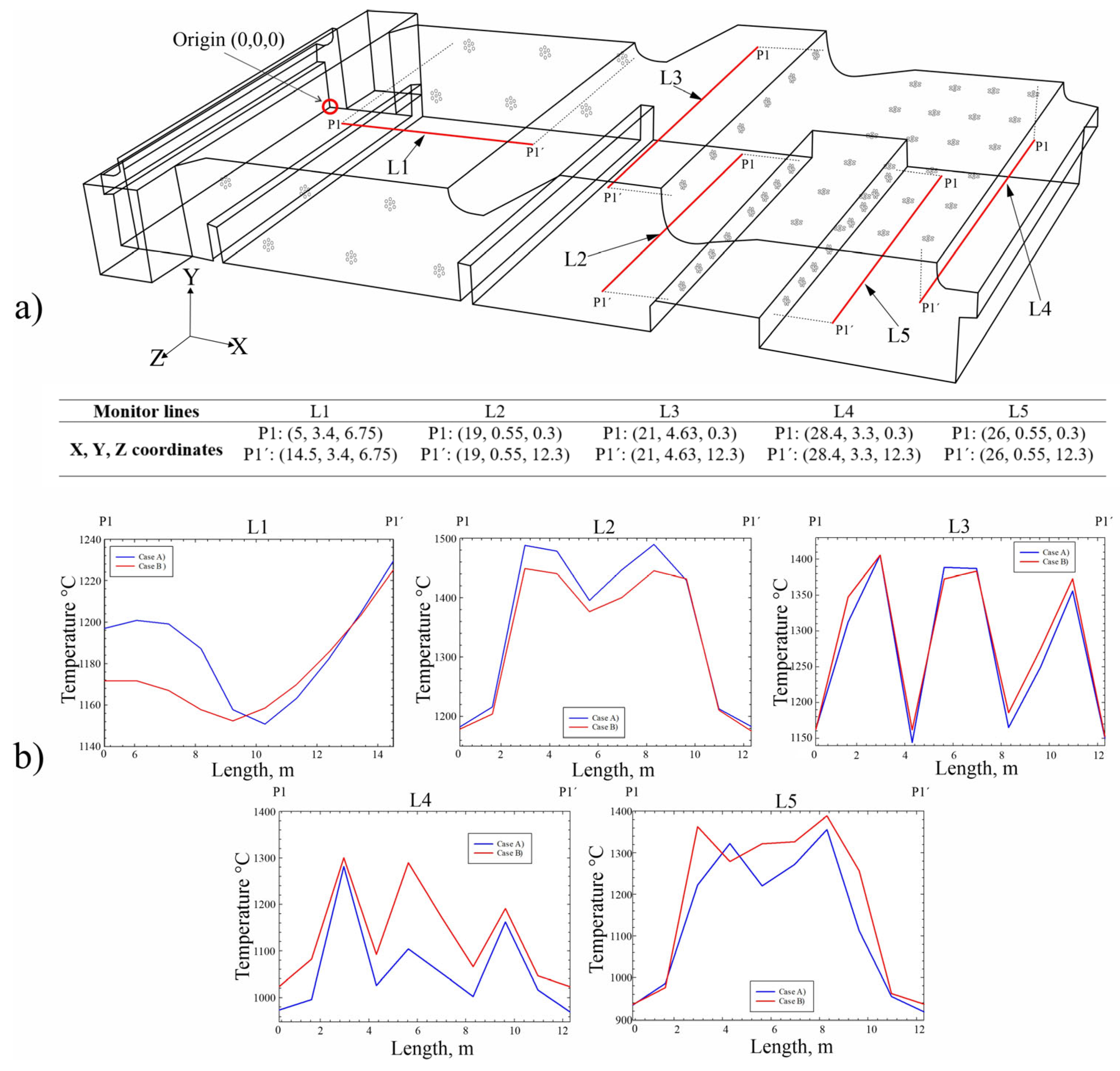 - Under the optimized conditions (Case B), the thermal gradient across the slab width decreased by up to 12–18 °C compared with Case A. This is critical for ensuring steel quality, as a homogeneous temperature distribution minimizes defects and microstructural variations in the steel. The average exit temperature improved to 1289.77 °C, 16 °C above the current case but still within the target range (1250 ± 50 °C).
