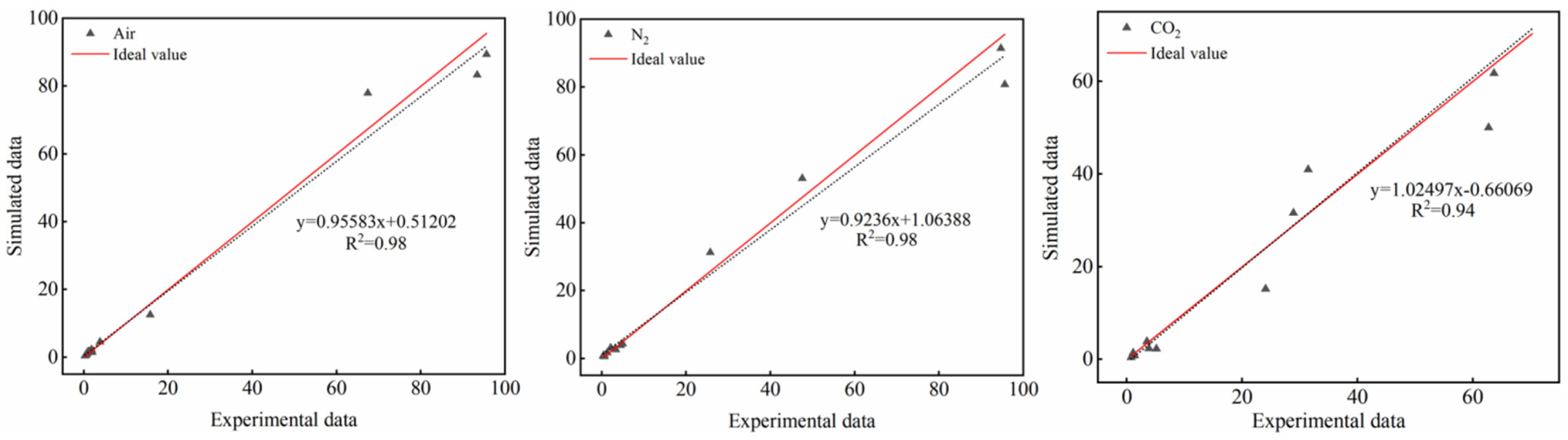 In Equations (1)–(4), and denote the raw simulated and measured gas composition values, respectively, for species j at data point k, and nj is the number of data points for species j. denotes the mean of the measured values for species j. All quantities were calculated directly from the raw simulated and measured values.