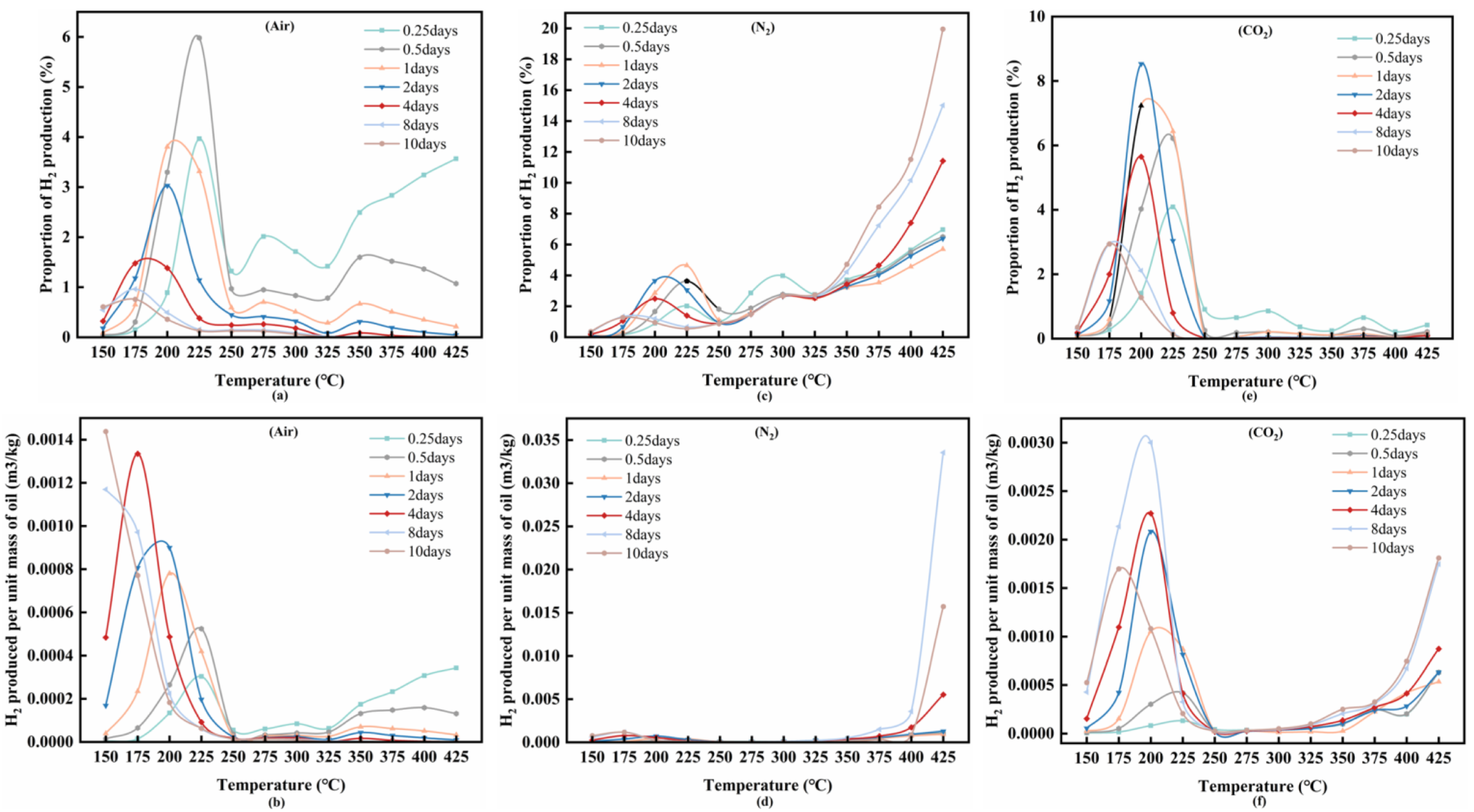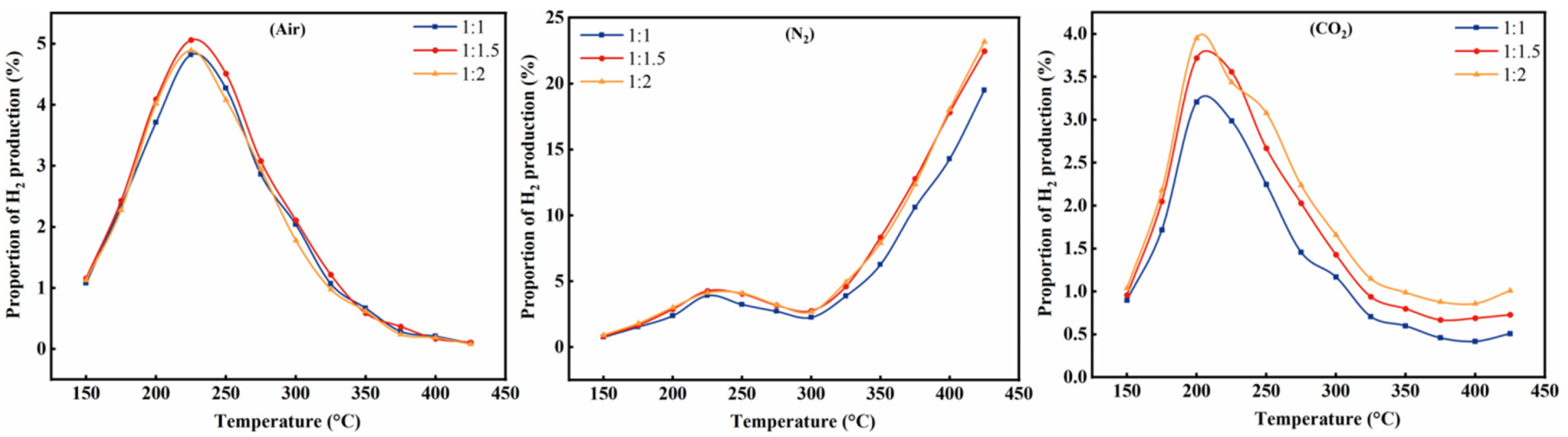 Under air, all three curves exhibit a bell-shaped temperature dependence with a maximum near 225 °C; the 1:1.5 case yields the highest H2 proportion in the medium-temperature window, suggesting that a moderate increase in water content is beneficial under oxidizing conditions. Under N2, the H2 proportion increases gradually at low temperature, passes through a shallow trough around 250–300 °C, and then rises sharply above 325 °C. In the high-temperature range, the order becomes 1:2 > 1:1.5 > 1:1, indicating that higher water content increasingly favors hydrogen generation in the absence of oxidative loss. Under CO2, the H2 proportion remains lower than under N2 over most of the temperature range; although the 1:2 case still gives the highest values, the curves peak around 200–225 °C before declining continuously. Overall, the preferred oil/water ratio shifts from 1:1.5 under air to 1:2 under N2 and CO2, reinforcing that atmosphere-dependent chemistry dominates the hydrogen response under the present reactor-scale conditions.