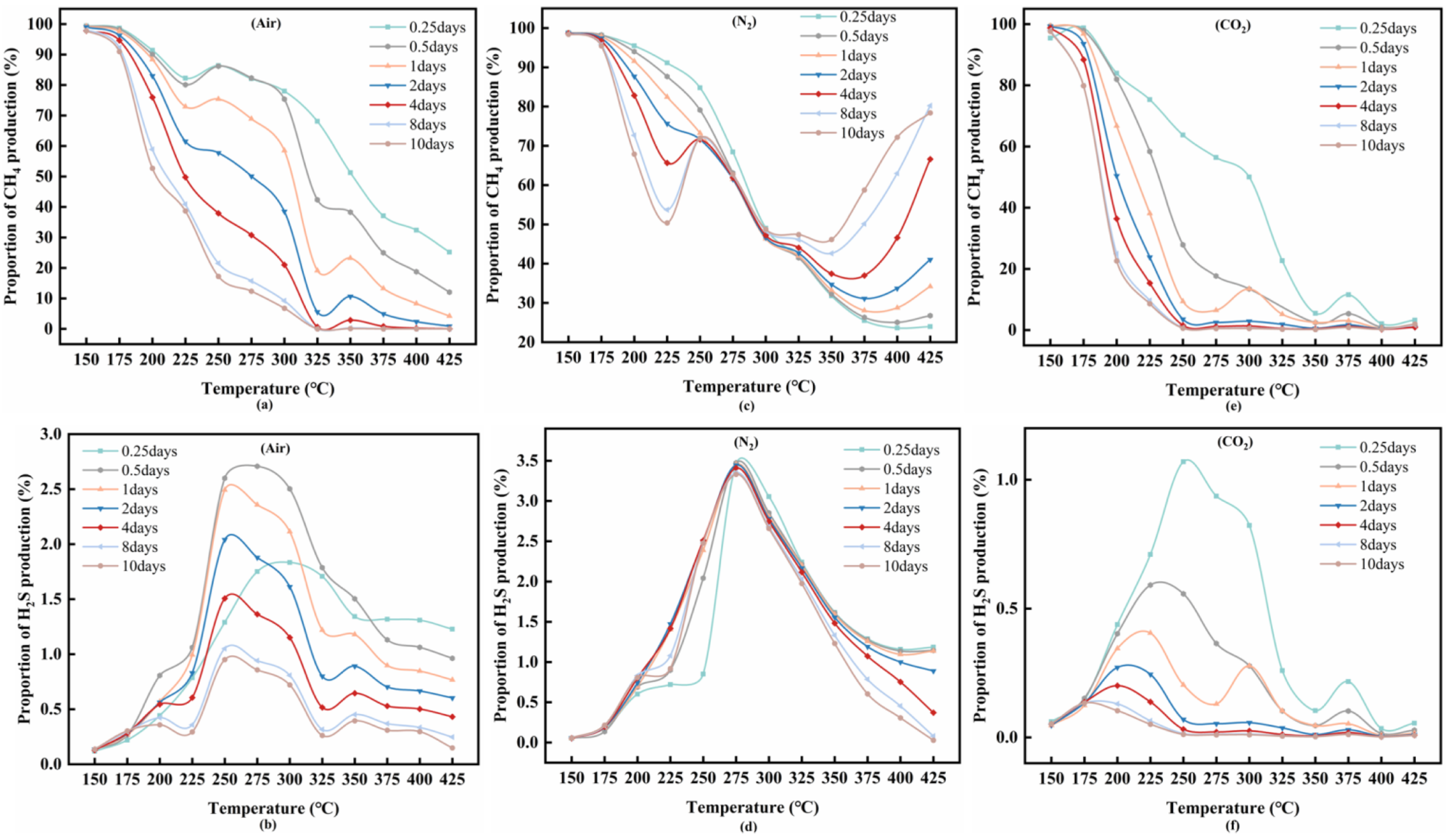 2S shows a temperature window that shifts slightly with time, which is consistent with the gradual liberation of sulfur-bearing fragments during early cracking and aquathermolysis. Across all atmospheres, a clear H
