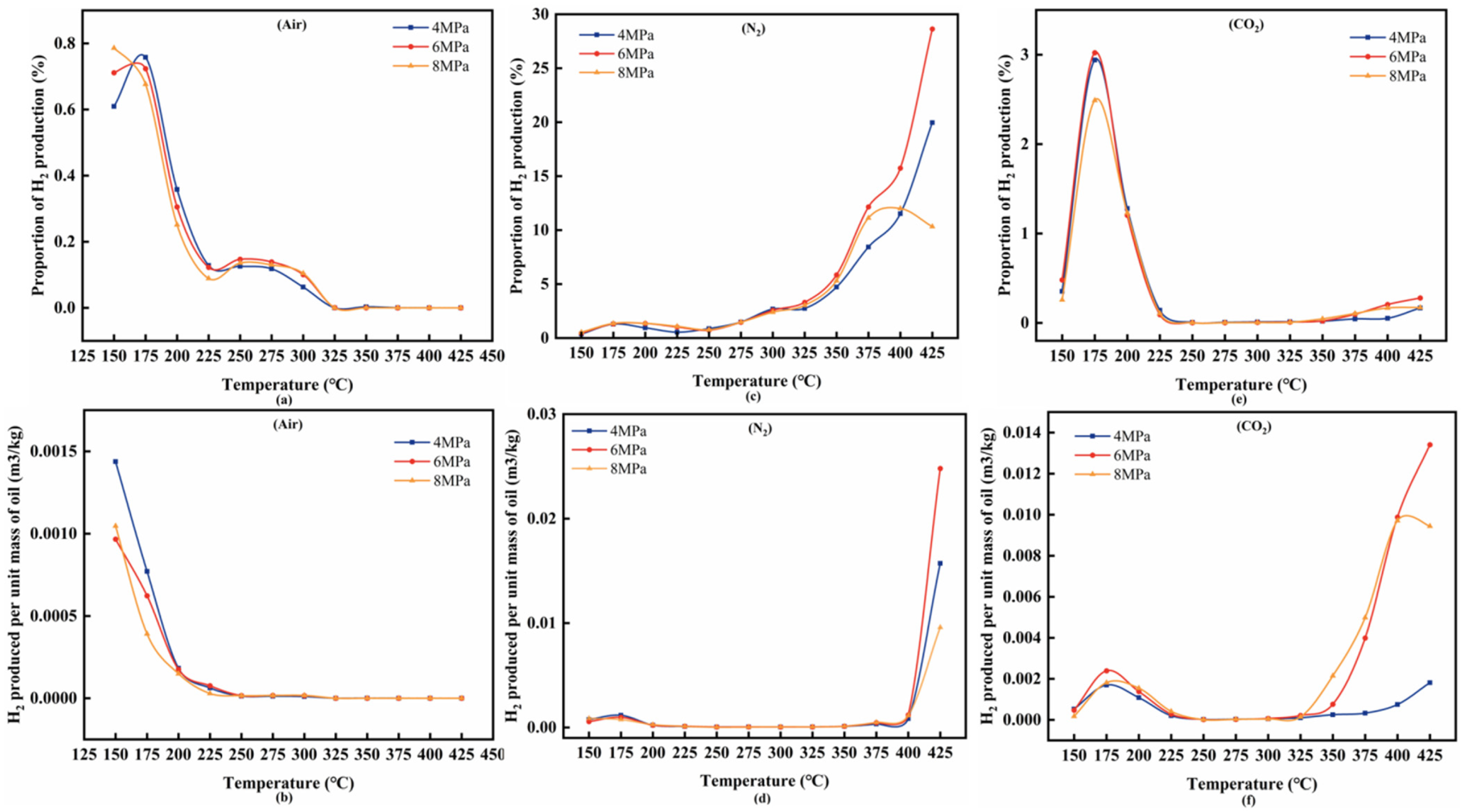 In CO2, the initiation-stage H2 fraction increases with pressure at first and then decreases, suggesting that moderate CO2 levels may facilitate certain steps, whereas excessive CO2 becomes inhibitive. In the high-yield regime, the H2 fraction remains low (around 0.5%), yet the specific yield rises to 0.0134 m3·kg−1 at 6 MPa and 425 °C. This divergence reflects the dual role of CO2, which can participate in coke-related routes that generate CO and, through the water–gas shift reaction, contribute to net hydrogen formation, while simultaneously diluting the produced gas and competing for reactive intermediates. The combined effect is that CO2-rich conditions may still deliver measurable hydrogen per unit oil even when the produced gas does not appear hydrogen-rich on a volumetric basis.
