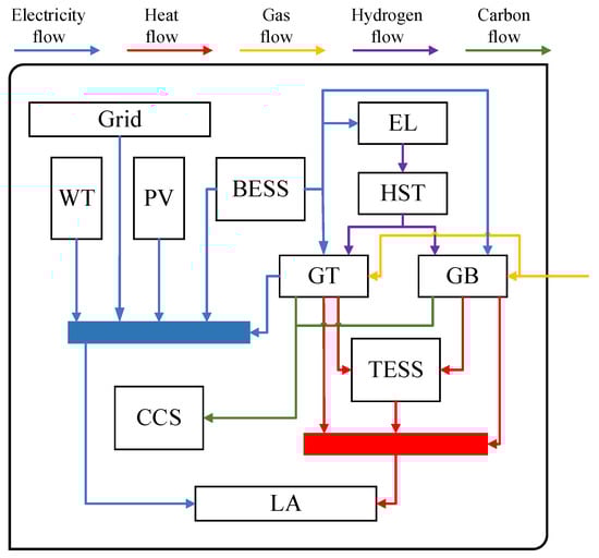 The ES incorporates various devices to produce, convert, and store energy, meeting users’ diverse demands. As shown in Figure 1, the system includes wind turbines (WT), photovoltaic panels (PV), and a Battery Energy Storage System (BESS) for electricity storage and dispatch. The Thermal Energy Storage System (TESS) stores heat for later use. A Hydrogen Blending System (HBS), comprising Hydrogen Blending System–Gas Turbine (HBS-GT) and Hydrogen Blending System–Gas Boiler (HBS-GB), enables low-carbon energy generation by blending hydrogen with natural gas. A Carbon Capture and Storage (CCS) system captures and stores CO2 emissions. The Electrolyzer (EL) in the HBS produces hydrogen, while the Hydrogen Storage Tank (HST) stores it for future use. The system is managed by the Load Aggregator (LA), which adjusts energy consumption based on price signals. These components work together to provide a flexible, efficient, and sustainable energy solution.