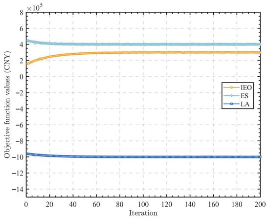 Furthermore, a comparison of the economic performance under Scenario 2 and Scenario 3 is conducted, as shown in Table 2. In Scenario 2, both the ES and LA experience negative revenues. The ES incurs a loss of −3.46 × 105 CNY, while the LA’s cost reaches −1.87 × 106 CNY, indicating limited incentive alignment under centralized coordination.
