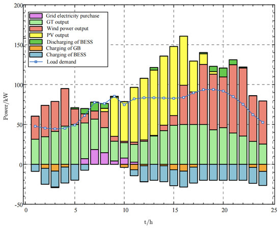 Figure 9 presents the 24 h optimized thermal energy scheduling results of the integrated energy system, including the outputs of GB and GT, as well as the charging and discharging behaviors of the HESS. As shown in the figure, GB output consistently dominates across all periods, while the system relies on the combined supply of GB and GT during nighttime and early morning hours to meet demand. The dynamic variations of HESS are also illustrated, where positive values correspond to heat release and negative values to heat storage. The HESS charges during low-demand periods and primarily discharges during evening peak hours, following a typical “valley charging and peak discharging” strategy that effectively balances thermal supply and improves energy utilization efficiency. Overall, the figure demonstrates that while achieving thermal supply–demand balance, the system fully leverages the coordinated regulation of various energy and storage units, thereby reducing dependence on external systems and enhancing both independence and economic efficiency.