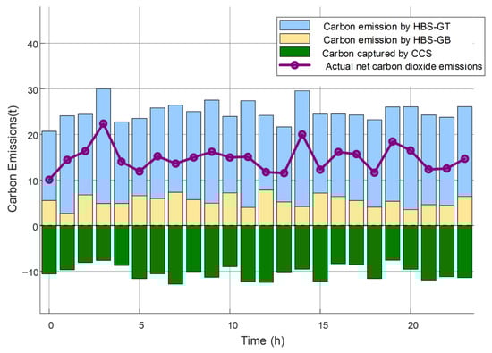 In contrast, Scenario 3 introduces hydrogen into the HBS operation, leading to further optimization of the system’s operational strategy. The blending of hydrogen directly reduces the carbon emission intensity per unit of energy output from the HBS-GT, thereby significantly lowering carbon emissions during power generation compared to Scenario 1. As a result, the overall carbon emissions demonstrate enhanced stability over time, with markedly reduced fluctuations. Simulation results show that net carbon emissions of the system are significantly reduced across multiple time intervals, highlighting substantial carbon mitigation effects.
