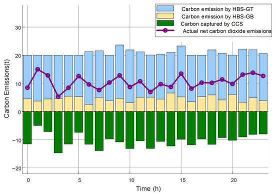 As illustrated in Figure 10 and Figure 11, the comparative analysis of Scenario 1 and Scenario 3 validates the role of the HBS as a key component for optimizing energy structure and reducing carbon emissions. In Scenario 1, the HBS operates under a Hierarchical game-based optimization approach without hydrogen blending, resulting in significant fluctuations in carbon emissions across different time periods. Particularly in the initial hours, carbon emission peaks were notably high, and the performance of carbon capture was unstable. Although the CCS captured a considerable amount of carbon during certain intervals, the overall net carbon emissions remained relatively high and exhibited considerable volatility due to the absence of synergistic hydrogen integration.