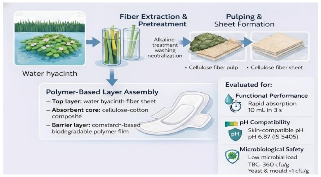 The multilayer design of the biodegradable sanitary pad created in this study included a top sheet, an absorbent core, and a barrier layer. Water hyacinth fiber-based nonwoven material, a sustainable substitute for conventional polypropylene nonwovens, was used to fabricate the top sheet. The softness, breathability, skin compatibility, and biodegradability of this layer addressed the environmental and comfort concerns associated with synthetic polymers [