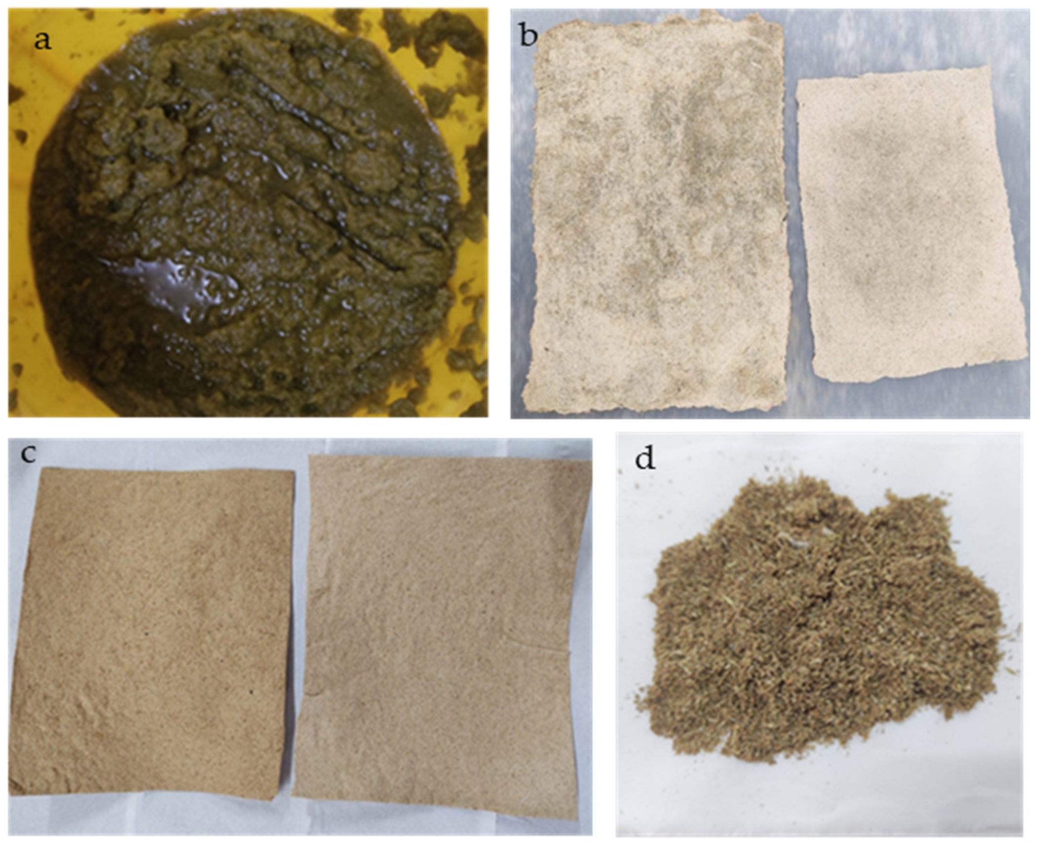 Figure 4a). The pulp’s soft texture and uniform dispersion enabled effective sheet formation without the addition of bleaching agents, binders, or synthetic additives. Naturally colored paper sheets were produced through handsheet formation and subsequently dried in sunlight (