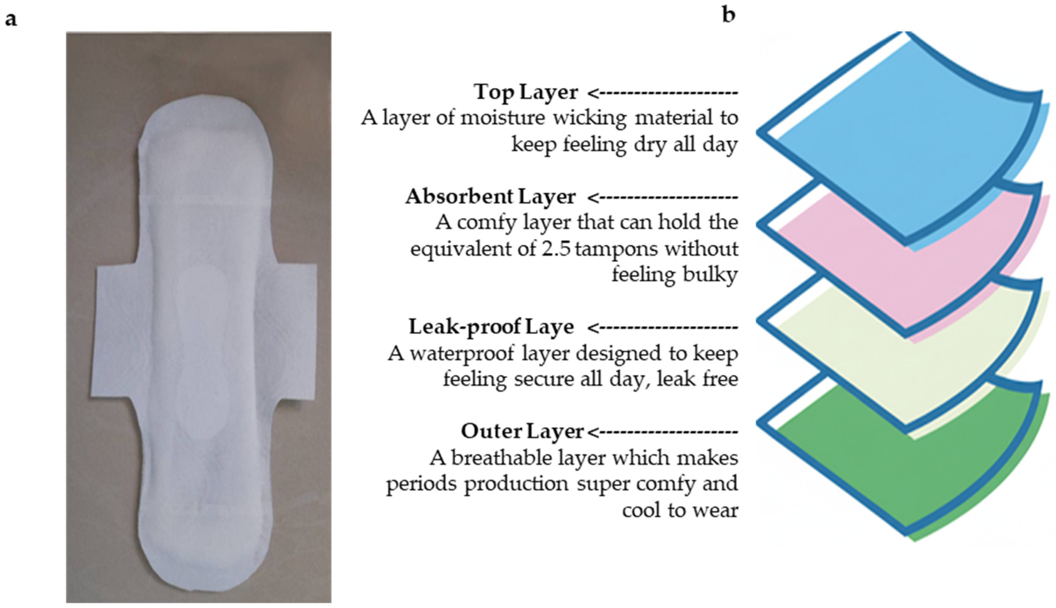 1]. The multilayered architecture of conventional sanitary napkins includes non-biodegradable materials such as polyethylene, polypropylene, superabsorbent polymers, and polymeric films [