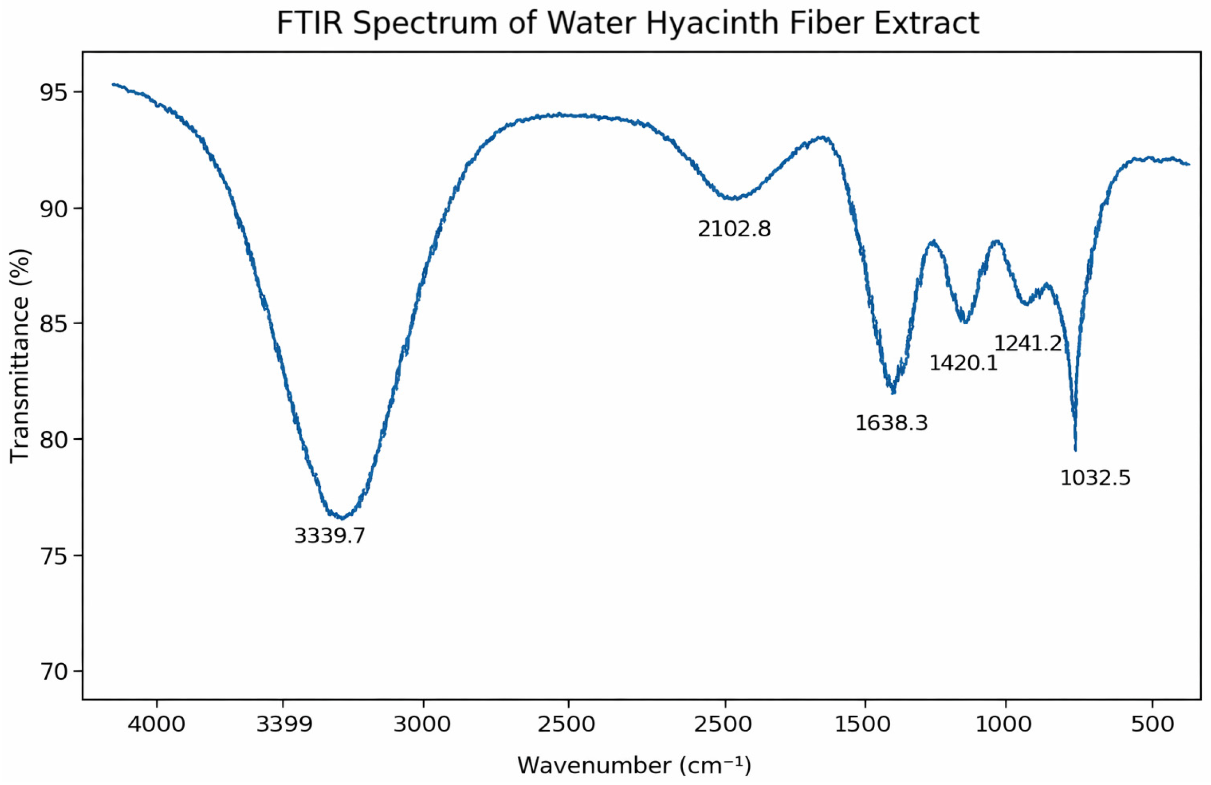 The FTIR results confirm the lignocellulosic nature of the water hyacinth fibers and indicate that bleaching successfully increased the cellulose content while substantially reducing hemicellulose and lignin impurities, thereby preparing the material for use in biodegradable and sustainable products.