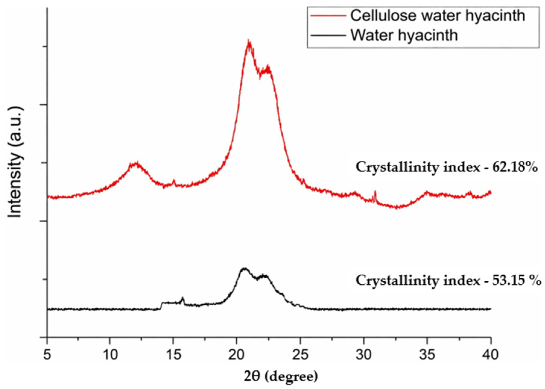 Figure 12. Both samples exhibited distinctive diffraction peaks indicative of the crystalline structure of cellulose I. With respect to the (200) and (110) crystallographic planes of native cellulose, the untreated water hyacinth showed a prominent diffraction peak centered around 2θ = 22° and a less intense peak near 2θ ≈ 16°. However, the peaks appeared broader and less intense, indicating the presence of amorphous components such as hemicellulose and lignin within the lignocellulosic matrix.