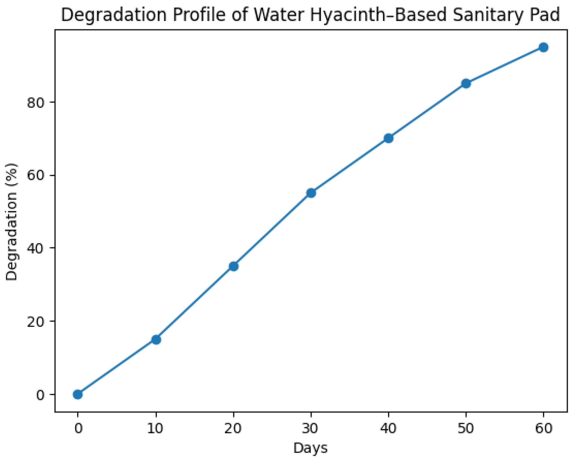 In the biodegradability testing, the sanitary pads demonstrated significant environmental benefits. Soil burial testing showed that approximately 70% degradation occurred after 40 days and nearly 95% degradation after 60 days, whereas traditional sanitary napkins show little or no measurable biodegradation even after several months. The biodegradability of the treated fibers was attributed to the high proportion of cellulose and hemicellulose in the material and the successful removal of lignin. Furthermore, since water hyacinth is an aquatic invasive weed, converting its biomass into useful products provides an additional environmental benefit by supporting circular bioeconomy principles and sustainable waste management.