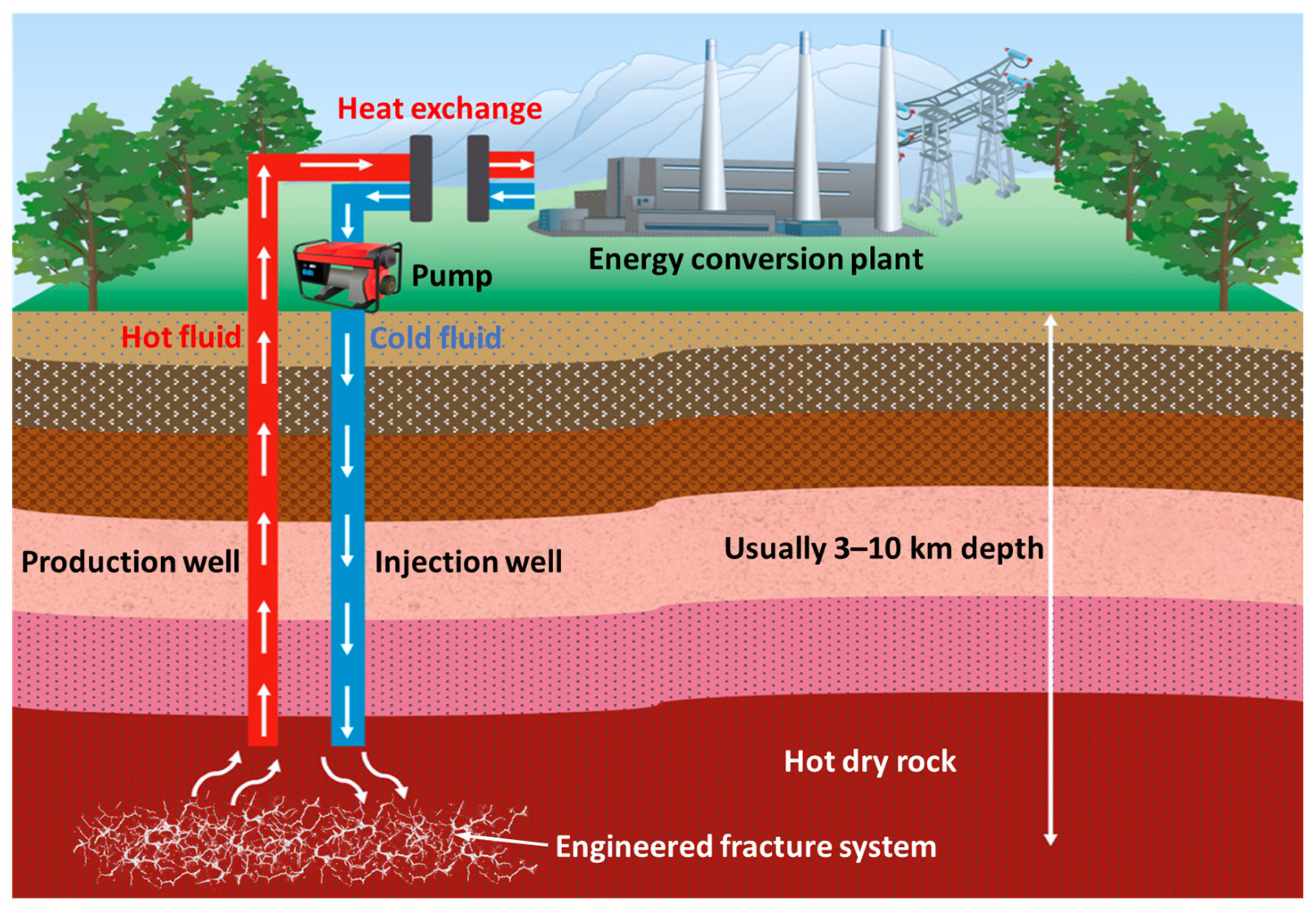 - Yuan, Y.; Zhang, X.; Yu, H.; Zhong, C.; Wang, Y.; Wen, D.; Xu, T.; Gherardi, F. Research Progress and Technical Challenges of Geothermal Energy Development from Hot Dry Rock: A Review. Energies 2025, 18, 1742. [Google Scholar] [CrossRef]
