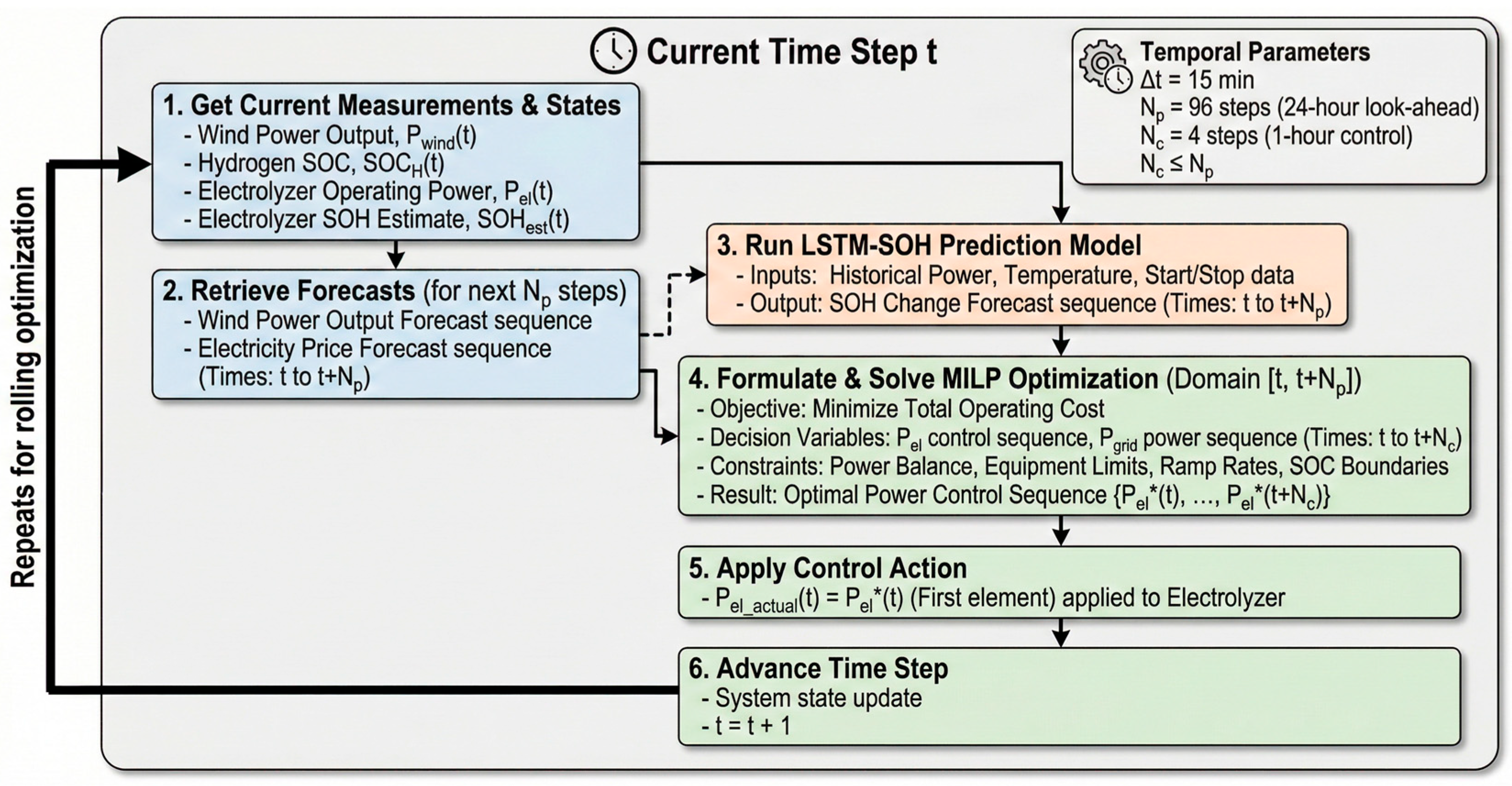 - A novel intelligent power allocation strategy based on model predictive control (MPC) and electrolyzer State-of-Health (SOH) prediction is proposed. This strategy integrates data-driven SOH prediction within the rolling optimization framework of MPC, quantifying electrolyzer lifetime degradation as real-time operational costs. This approach enables simultaneous optimization of short-term economic efficiency and long-term reliability.