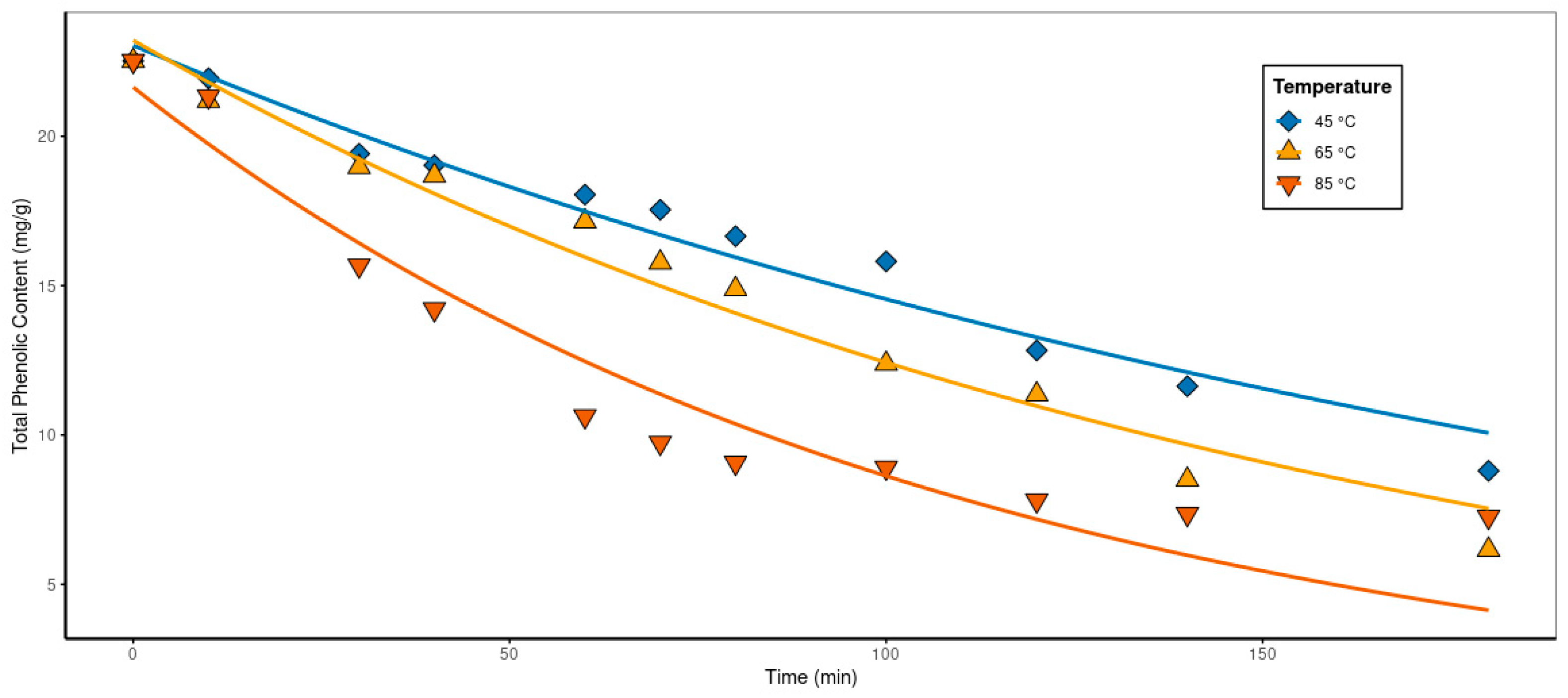 Figure 9 shows the correlations between moisture ratio values and total phenolic content for temperatures of 45, 65, and 85 °C. It should be clear that these results must be analyzed carefully—and should not be extrapolated to other experimental conditions—since moisture (represented by the moisture ratio) and total phenolic content vary over time and depend on other factors. On the other hand, they can provide useful insights into the conditions of the experiment. In this sense, the data presented for each temperature in
