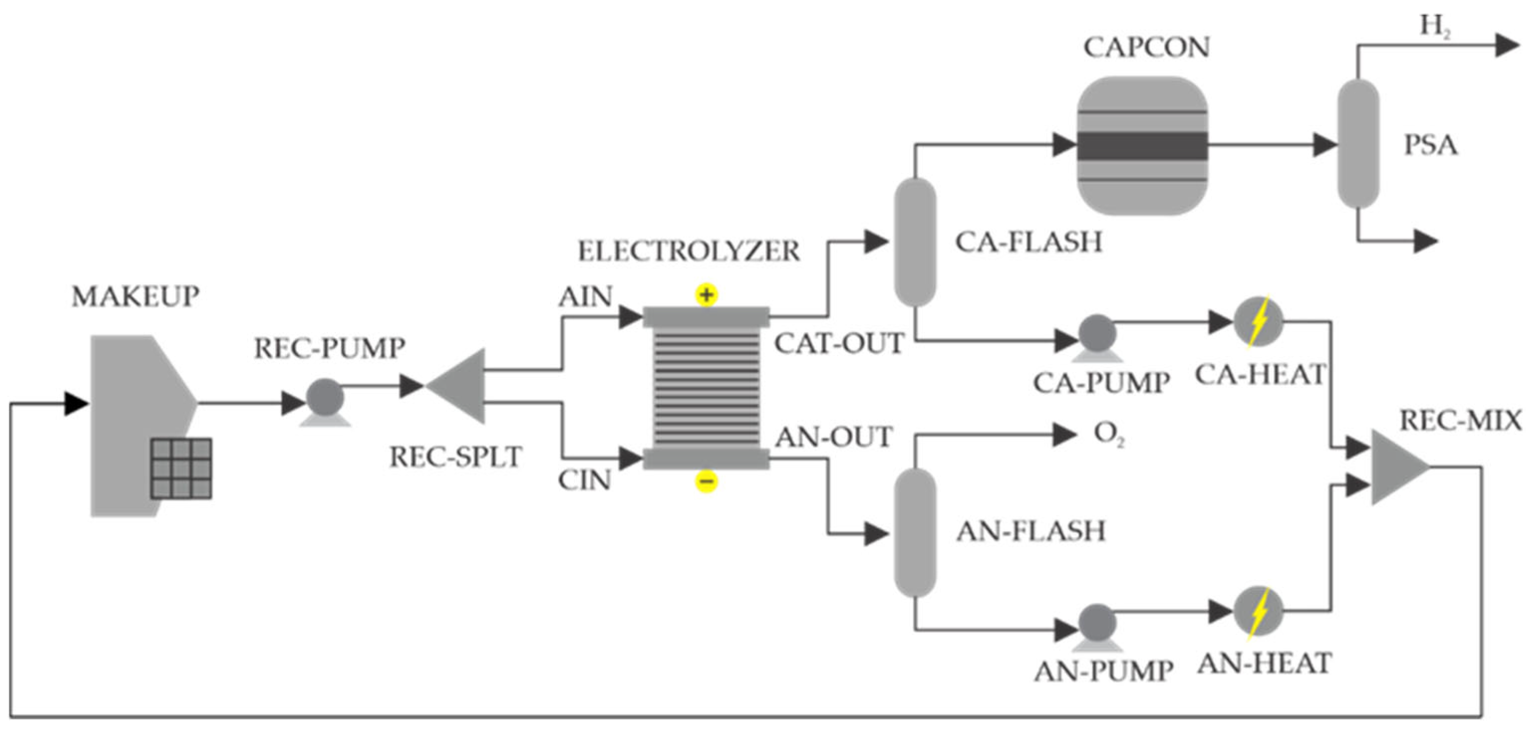 - Gonçalves, J.R.M.; Cecílio, D.M.; Oliveira, R.C.P.; Mateus, M.M.; Santos, D.M.F. Development of an Aspen Plus® model for the process of hydrogen production by black liquor electrolysis. Symmetry 2022, 14, 1676. [Google Scholar] [CrossRef]