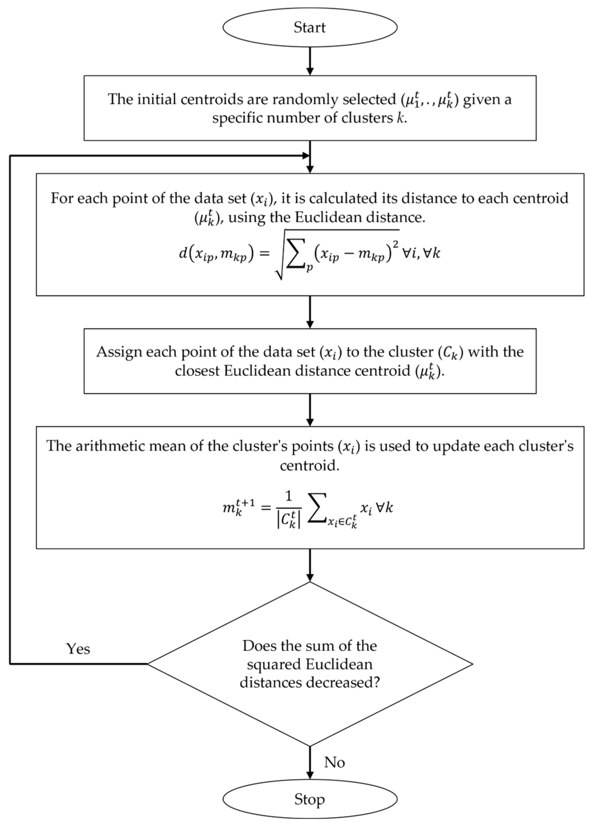- For each point in the database () in the p-dimensional space (), the distance to each centroid () is calculated, using in this case the Euclidean distance as a dissimilarity metric, as presented in Equation (16). In addition, each dimension represents a feature of the dataset.
