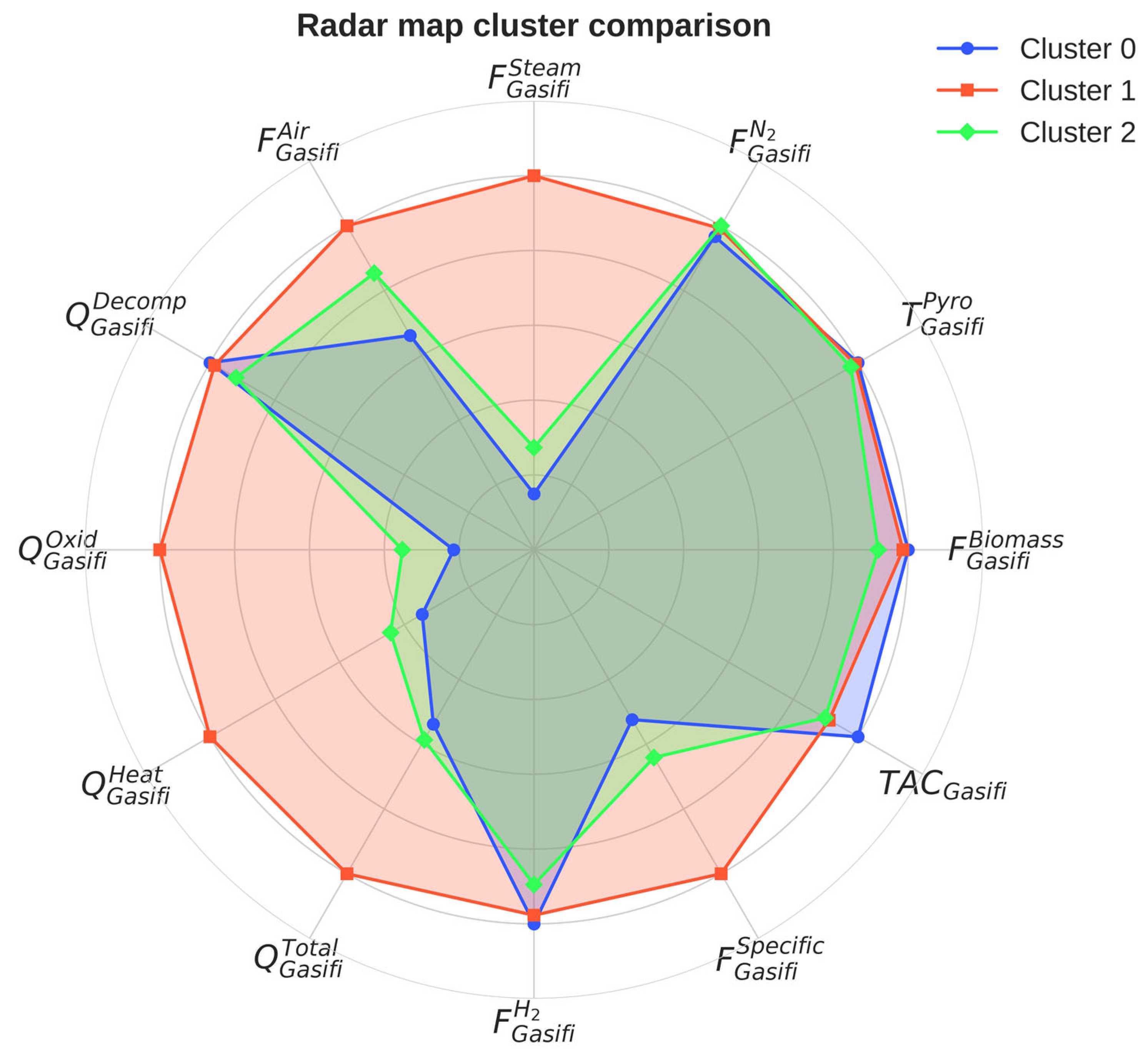 - K-means clustering analysis: to deepen the interpretation of the solutions obtained, the K-means algorithm, an unsupervised machine learning clustering method, is applied to the results generated by MODE, using Python™ (version 3.14.x) as the programming language. Previously, the data were standardized using the Standard Scaler technique of the scikit-learn library, normalizing each variable according to its mean and standard deviation. Subsequently, the optimal number of clusters is determined using the elbow method, identifying three representative groups from the inflection point in the square Euclidean distances curve. Finally, the K-means algorithm is executed to segment the solutions, allowing configurations with similar behaviors in terms of hydrogen production, energy consumption, and total annual cost to be grouped. It is worth highlighting that clustering methods have a wide variety of applications, not only in multi-objective optimization, but also in Process Systems Engineering (PSE) for data classification to improve processes, operational monitoring, system failure detection, and time-dependent process modeling, among many other purposes.