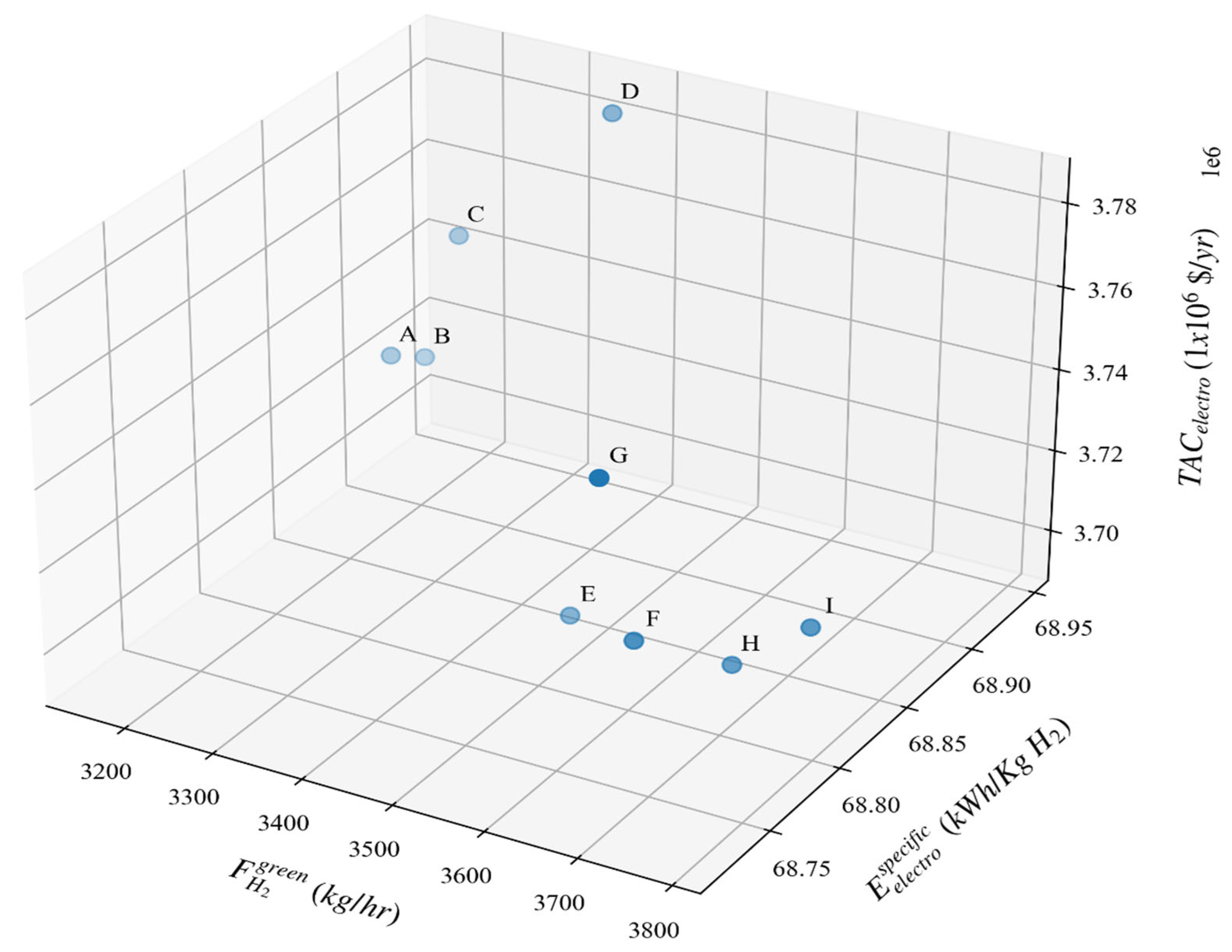 - Multi-objective optimization: this stage is formulated as a multi-objective optimization problem, simultaneously considering the maximization of green hydrogen production, the minimization of specific energy consumption, and the total annual cost. Optimization is implemented by integrating Aspen PlusTM with the Differential Evolution Tabu List (MODE) algorithm, using Visual Basic for Applications (VBA) in Microsoft ExcelTM as the integration platform. The results obtained are normalized using the Min-Max scaling technique to bring the target functions to a common scale. Based on these values, a Balance Score (BS) is calculated to identify the most balanced solution [37] to be identified by simultaneously considering the maximization of hydrogen production and the minimization of energy consumption and total annual cost.