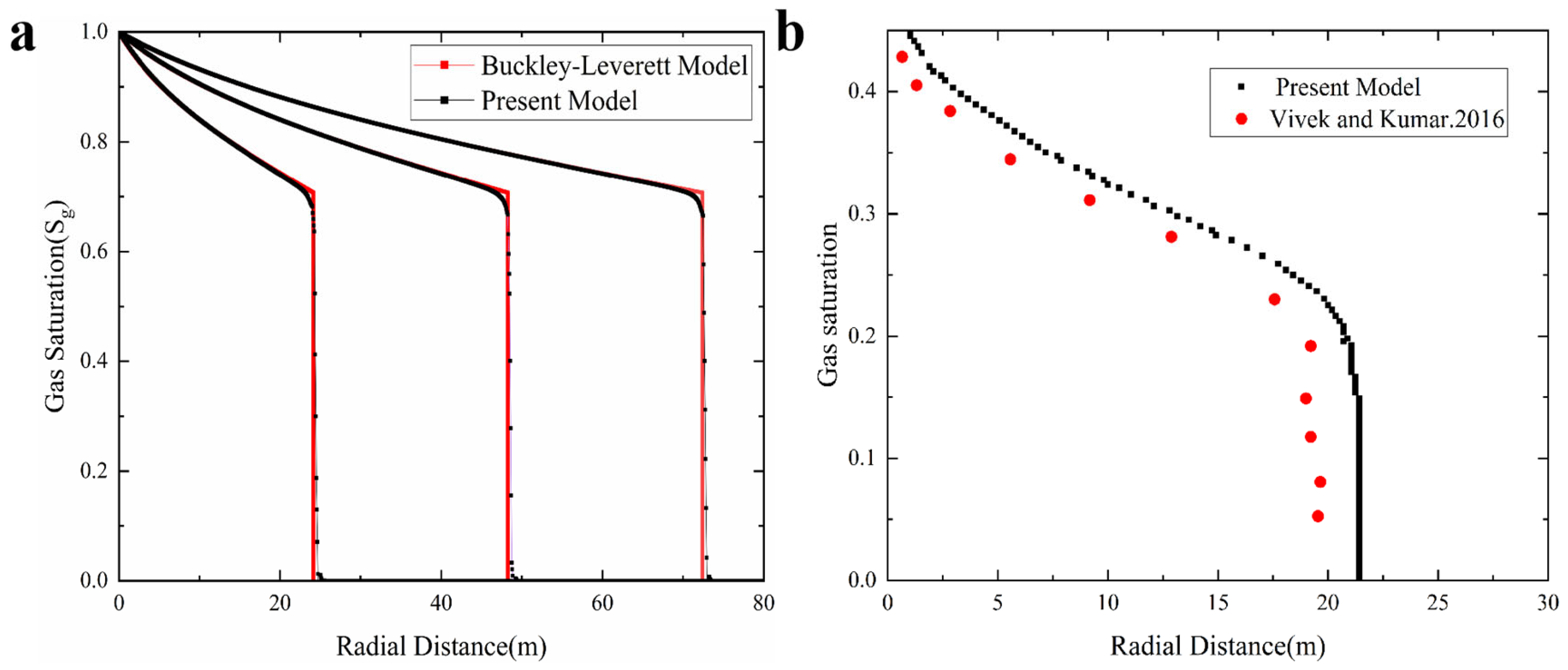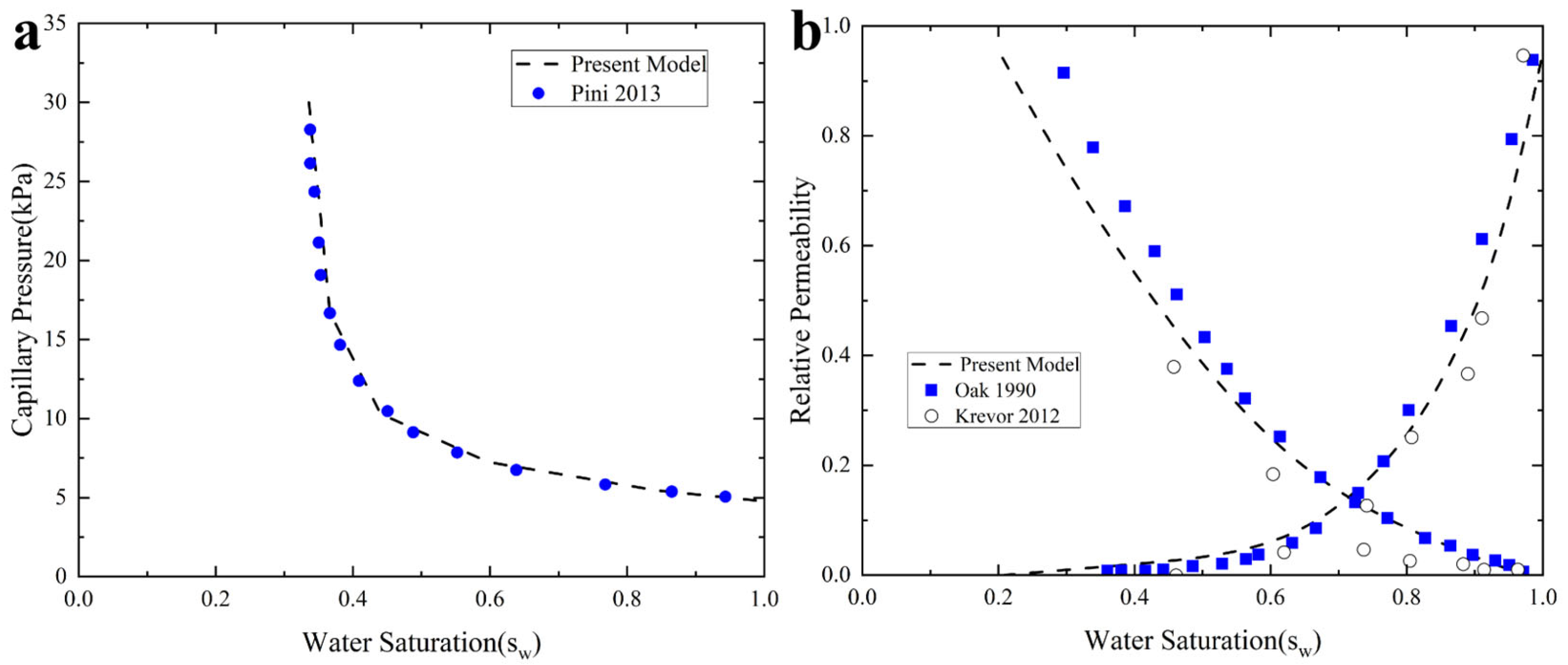 Pw is the pressure of the wetting phase. To analyze the changes in gas-liquid phase saturations, this study introduces the Brooks and Corey model [