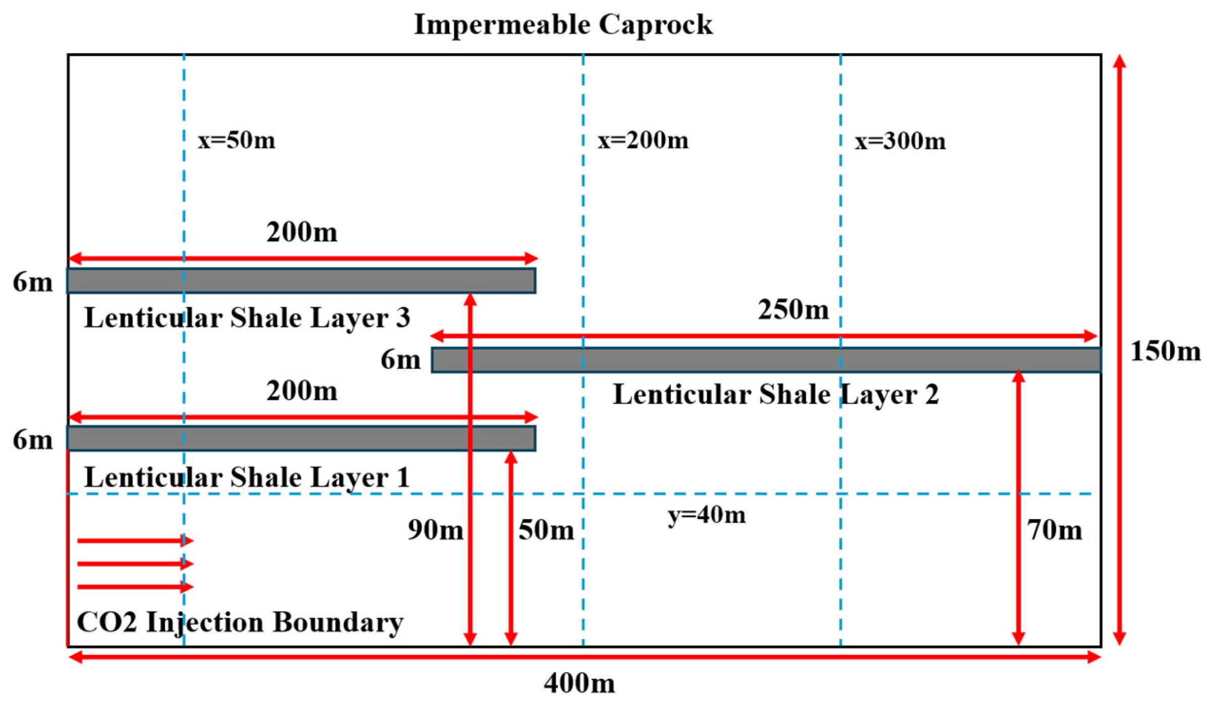 25]. In this study, we construct a geological model that includes lenticular shale layers through numerical simulations to investigate the effects of lenticular shale layer geometry, reservoir permeability anisotropy, and injection velocity on CO