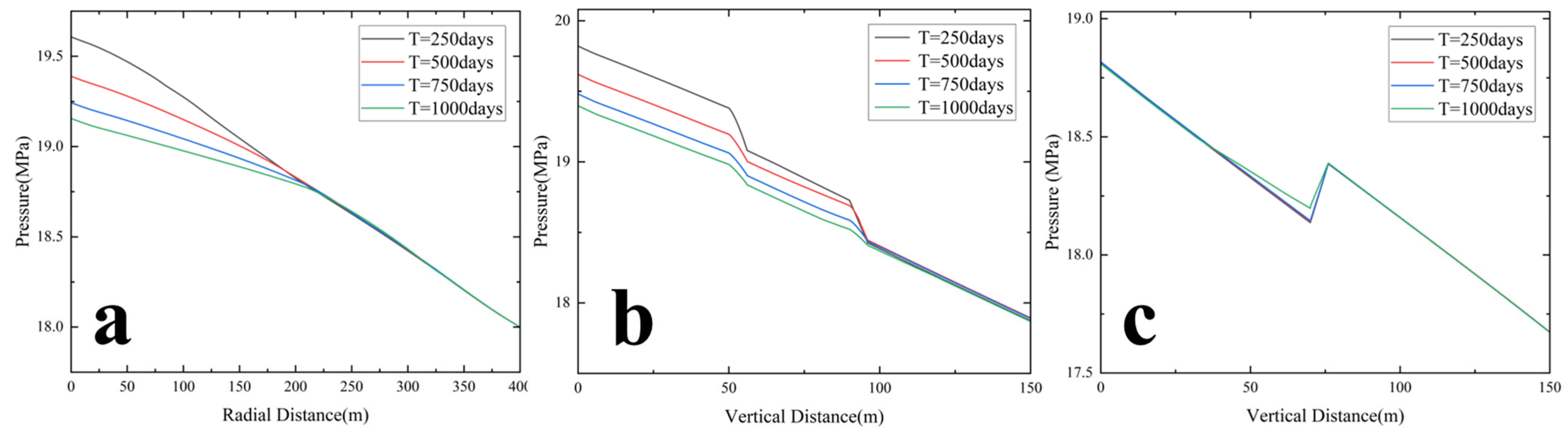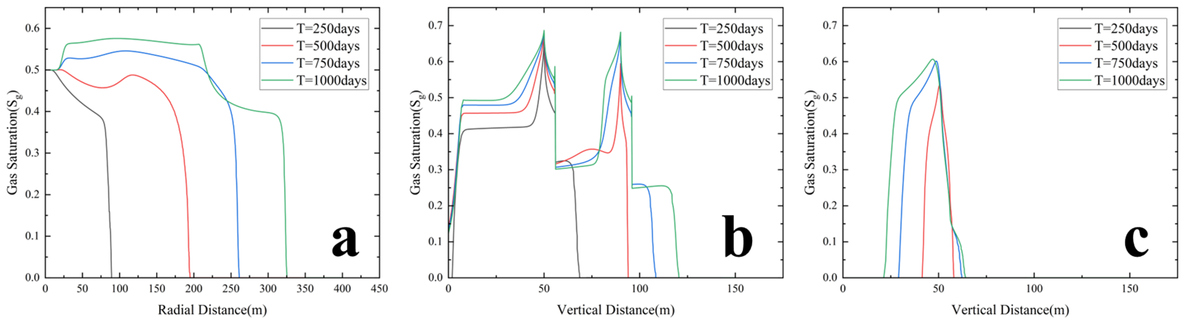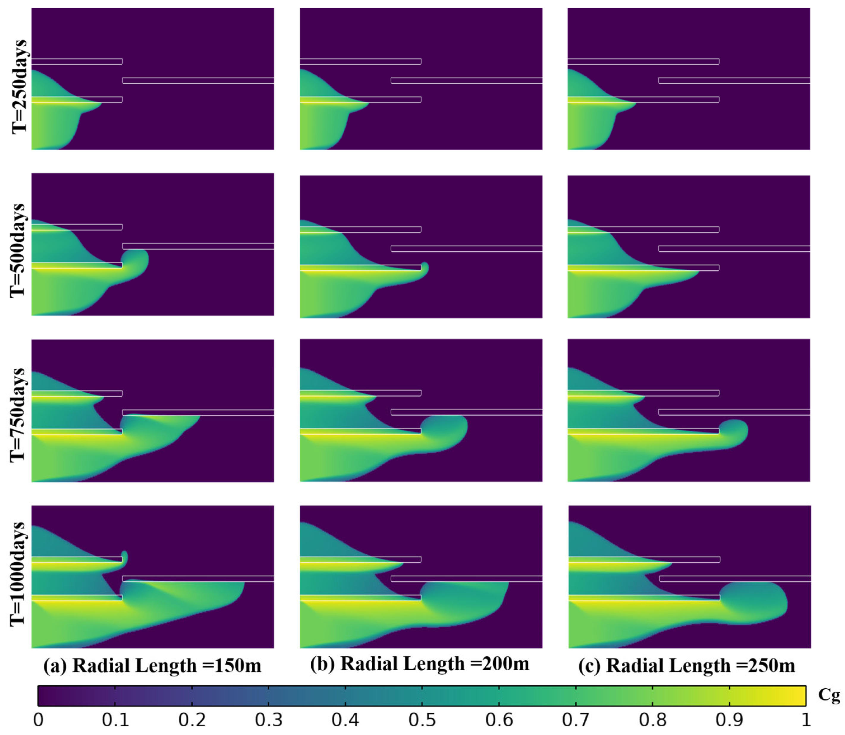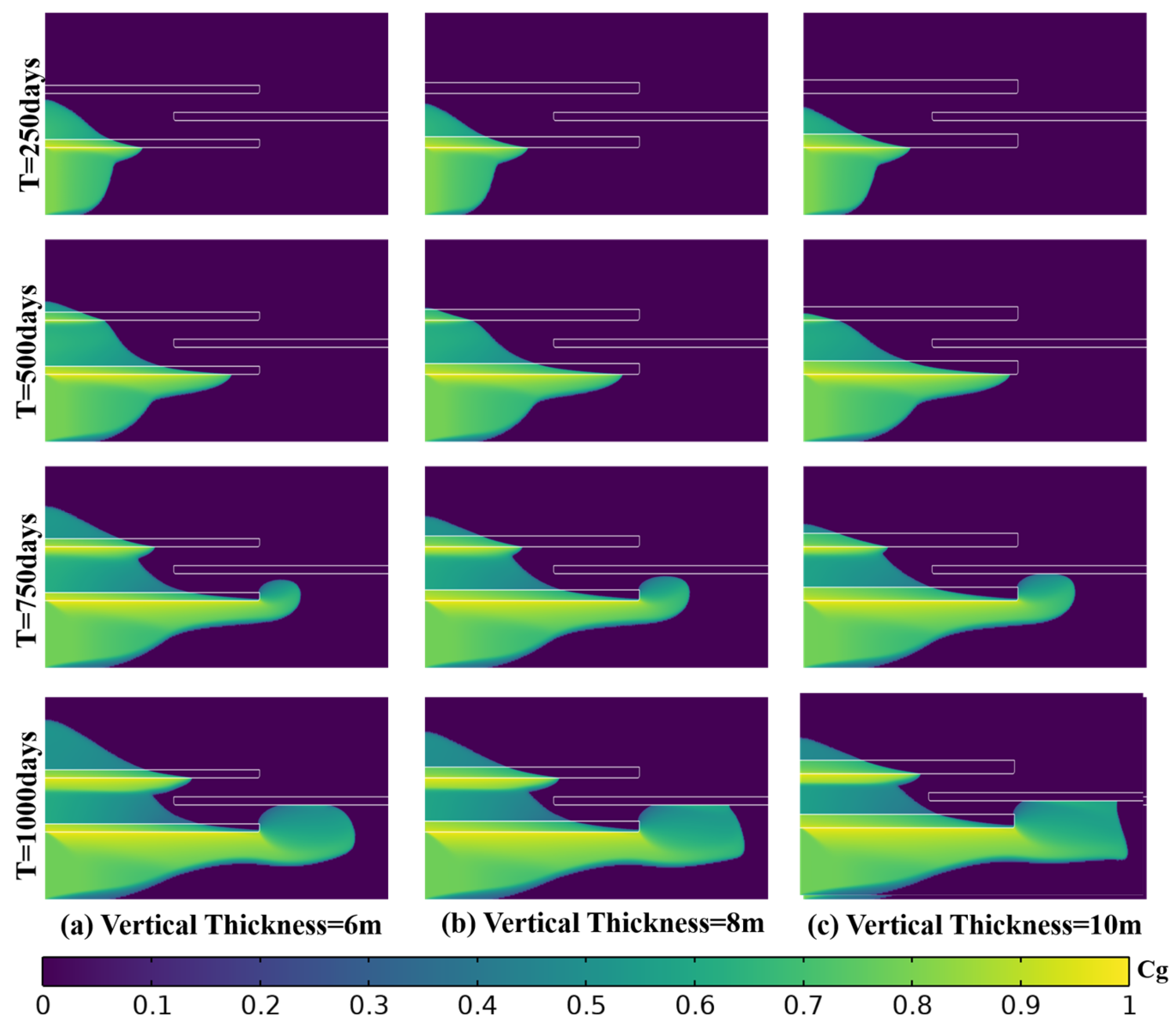 Figure 13 shows simulations with a fixed shale radial length and shale vertical thicknesses of 6 m, 8 m, and 10 m. The three cases show that the large-scale migration pathway of the high-concentration plume remains similar from day 250 to day 1000. In all cases, CO