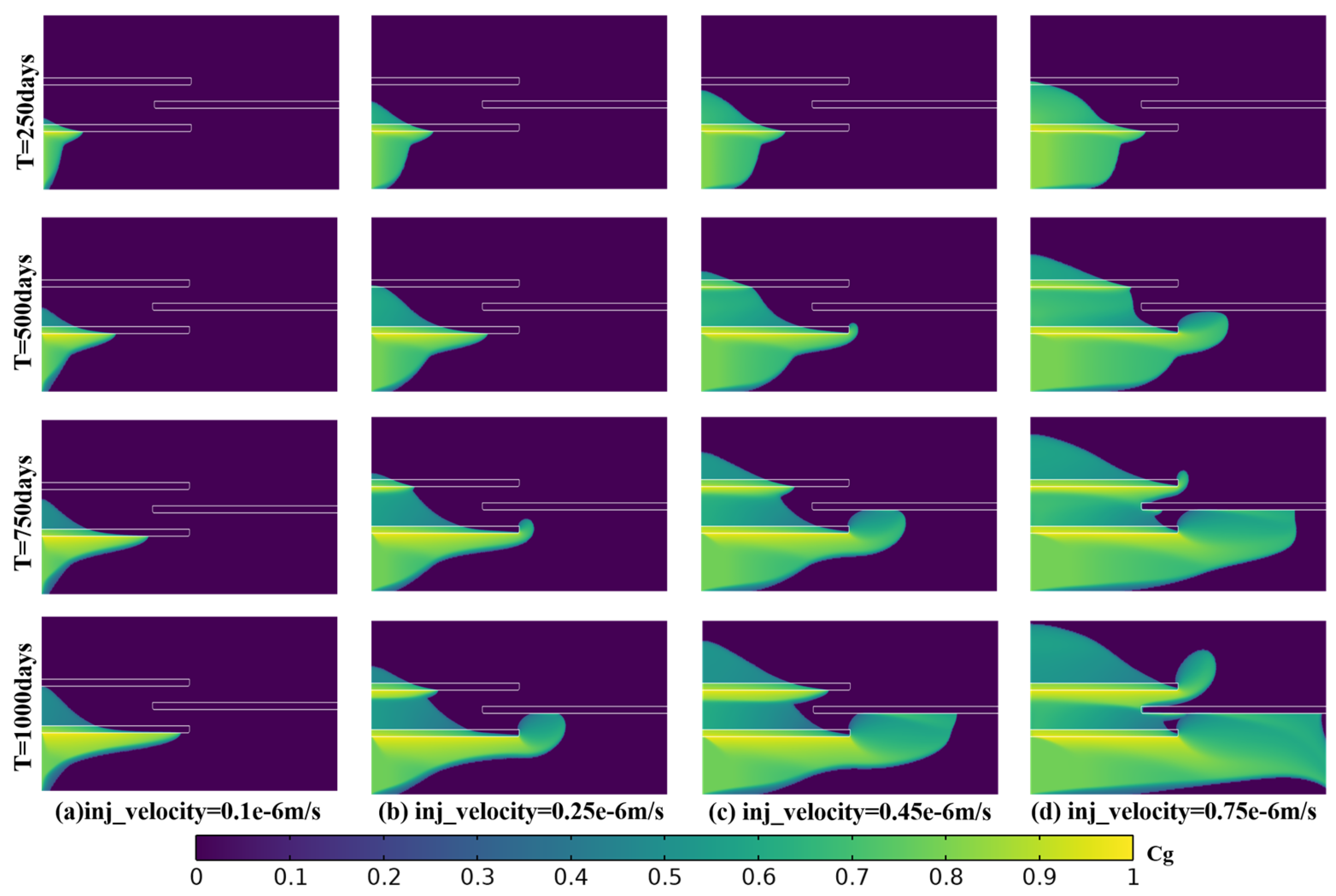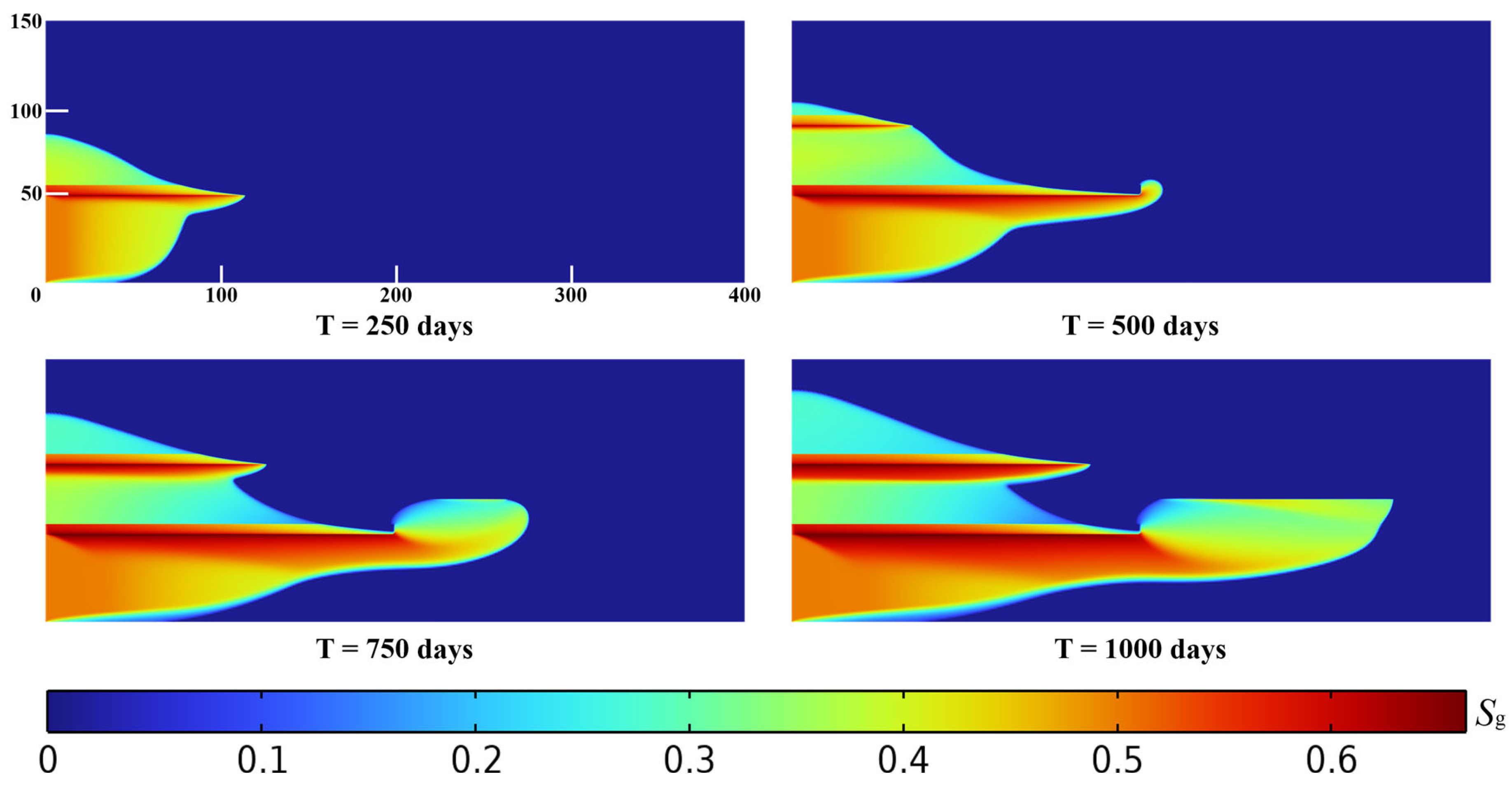 2 concentration from day 250 to day 1000. At low injection rates, buoyancy controls migration as shown in