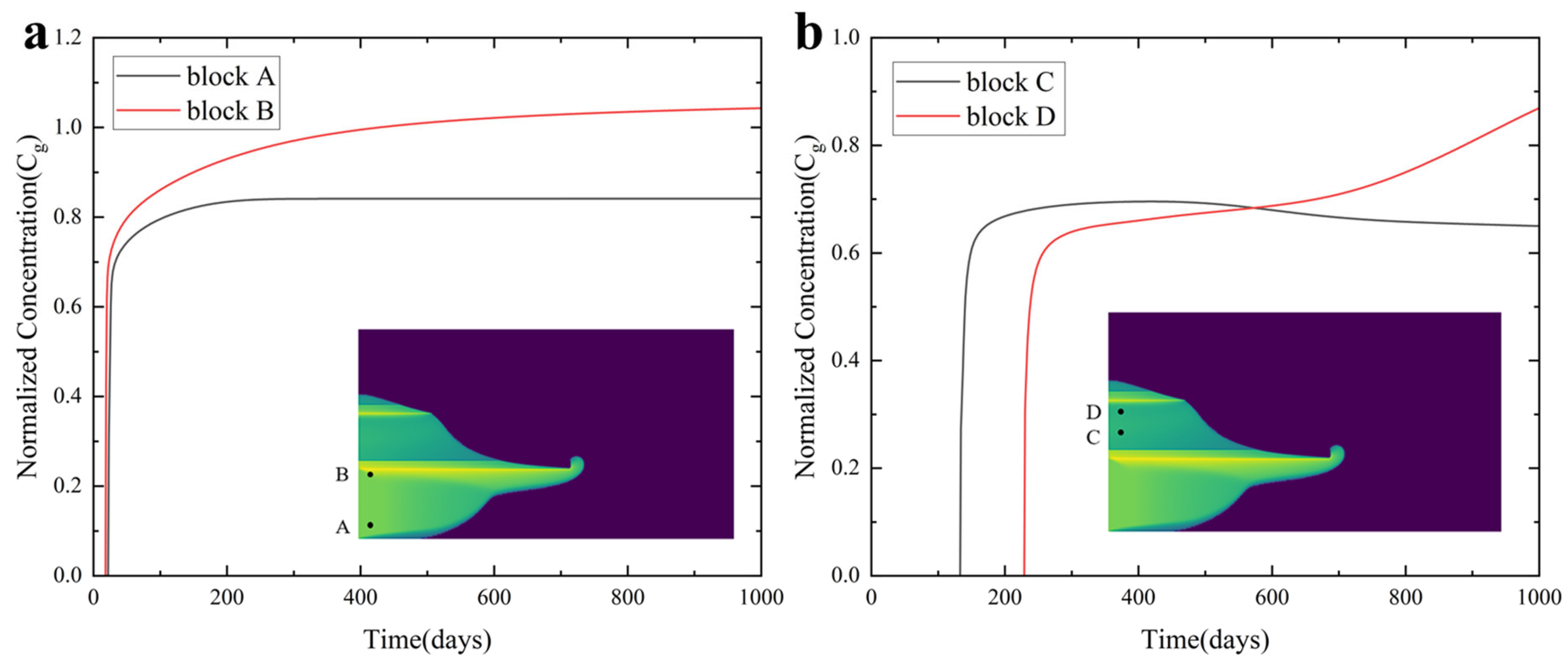 Figure 11a shows that, under isotropic conditions, migration is dominated by vertical flow, and the high-concentration region exhibits pronounced vertical penetration. From day 500 to day 1000, high-concentration CO
