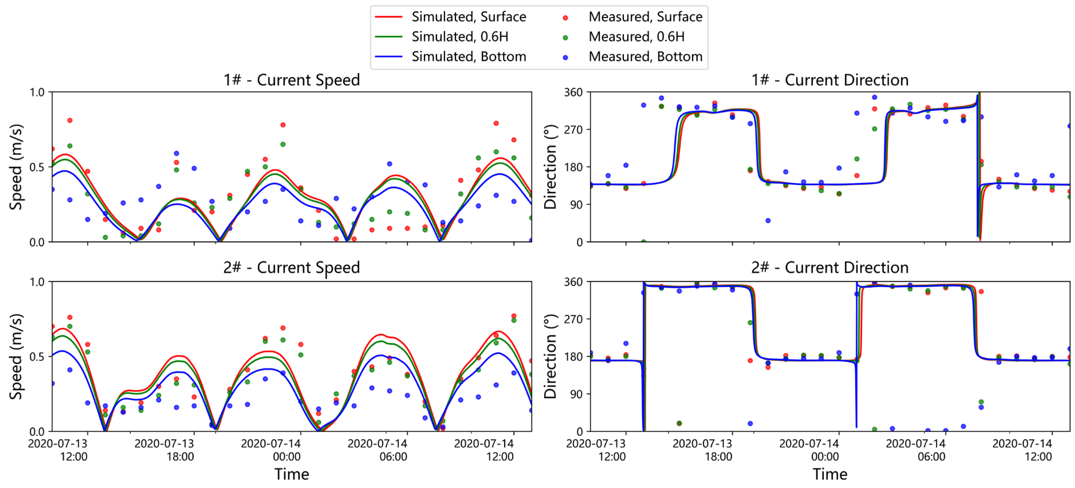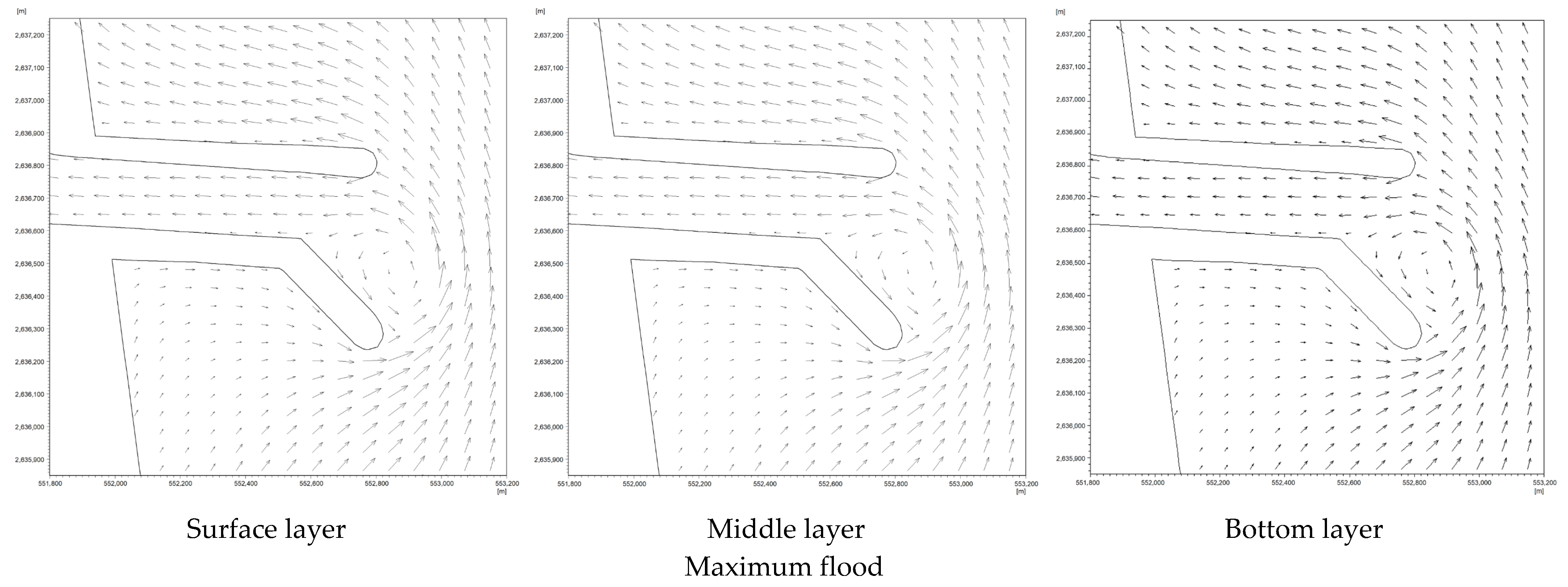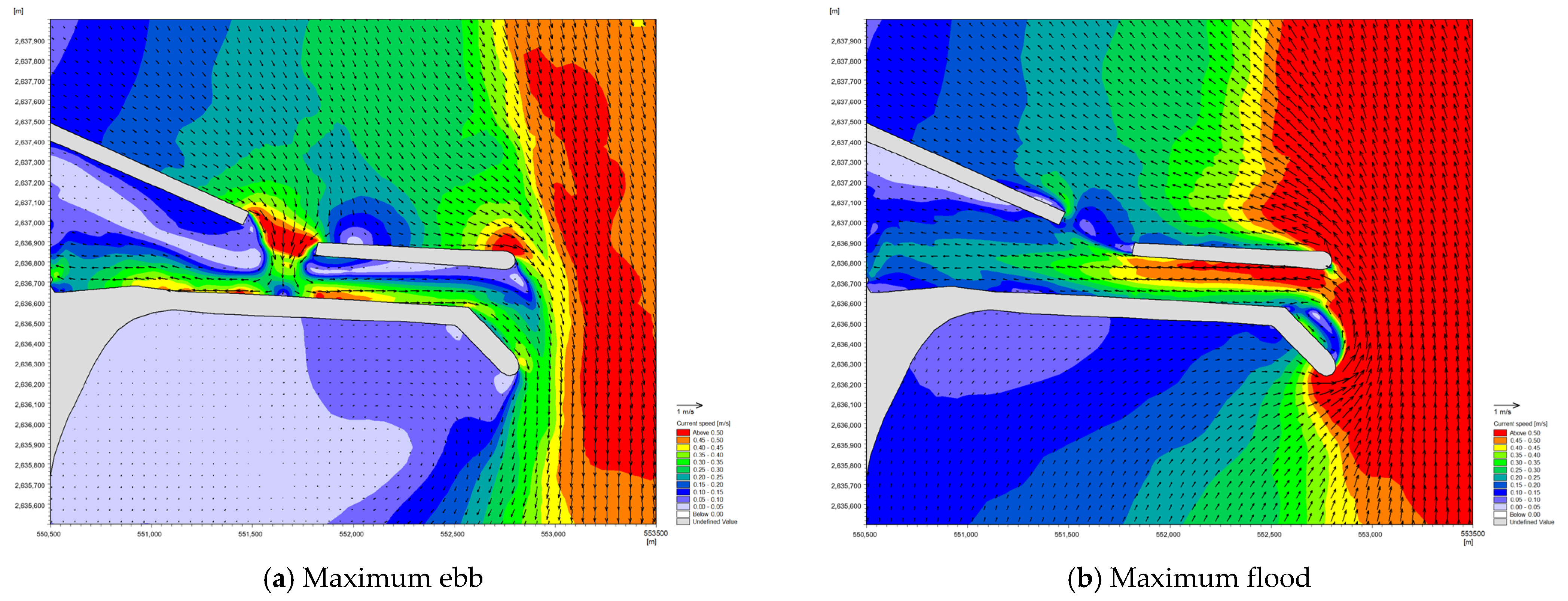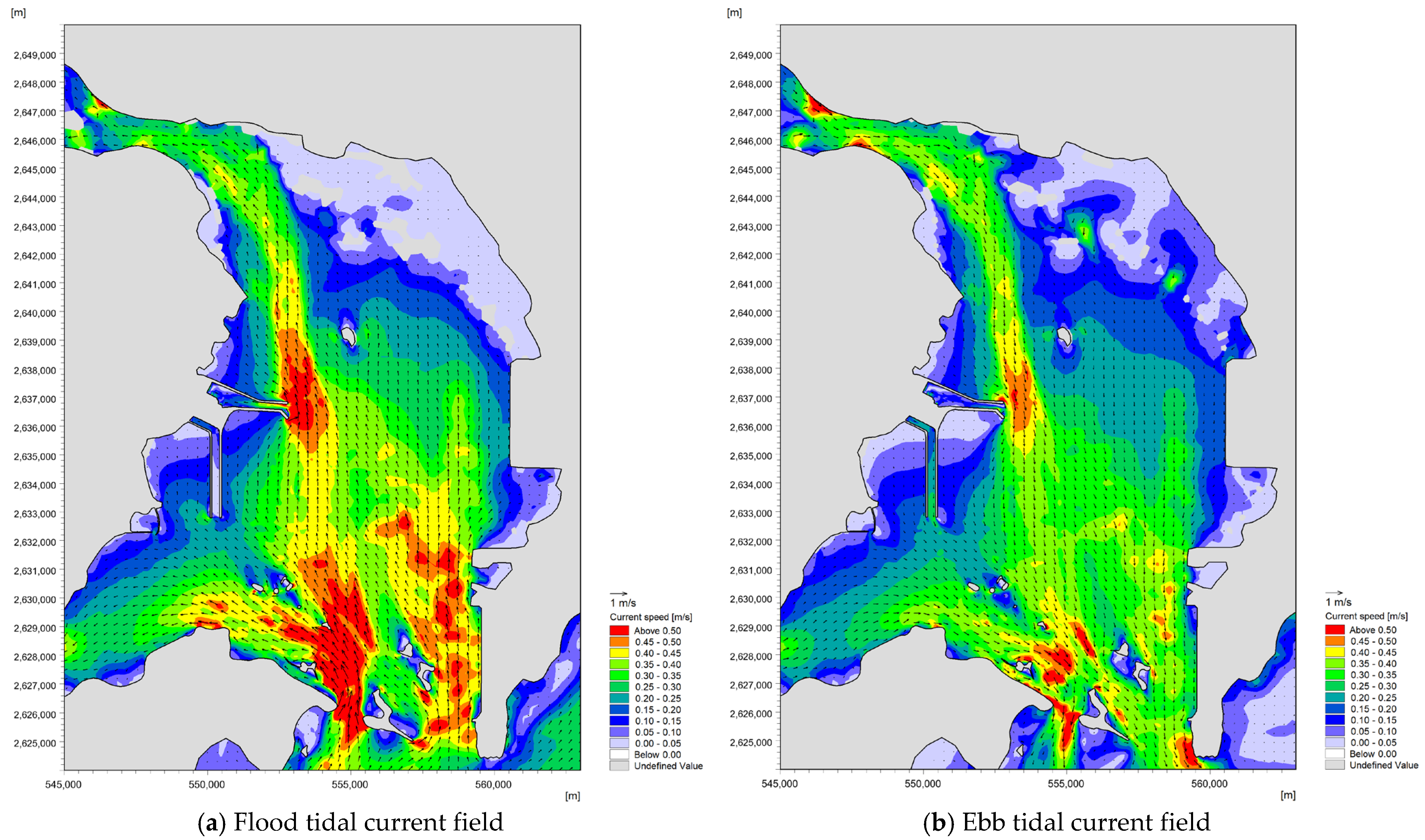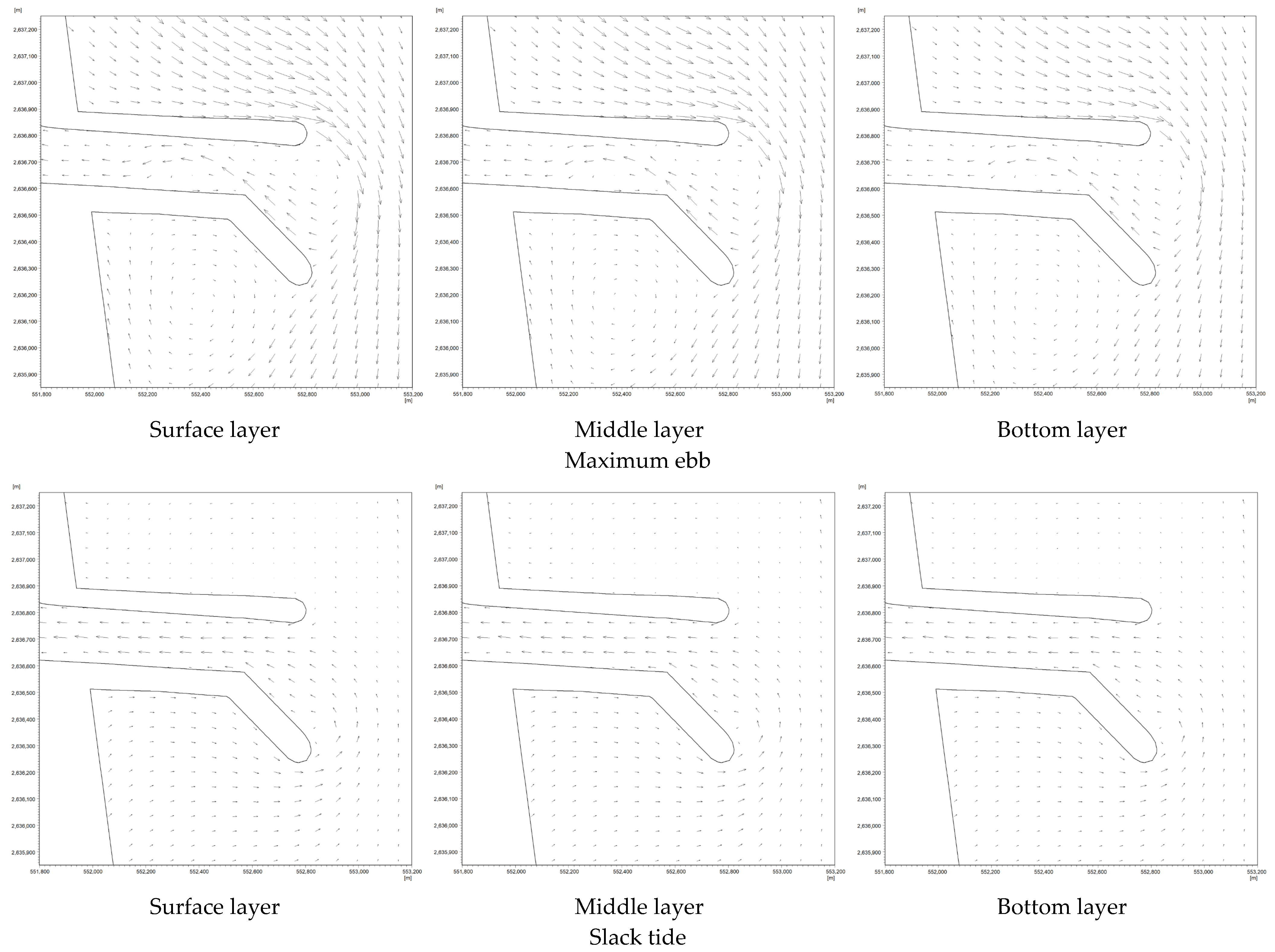 Figure 14 show the flow fields in the vicinity of the engineering area for different intake open-channel configurations during characteristic tidal phases (maximum ebb and maximum flood) in the summer neap tide. In