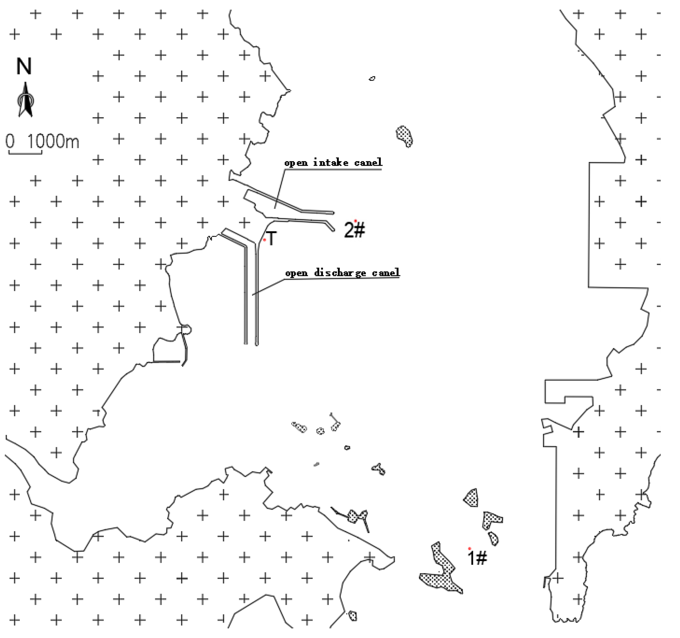 A nuclear power plant (Fujian, China) is located on the western coast of Dongshan Bay, with plans to construct six million-kilowatt-class pressurized water reactor nuclear power units. Units 1–6 share a common open intake channel. The intake entrance is situated near the deep trough on the eastern side of the plant site, adopting a splayed configuration. A heavy equipment wharf for nuclear power components is constructed inside the intake channel, serving as a branch channel for the heavy equipment wharf. The channel engineering has been completed, and the intake entrance is located near the deep trough on the western side of central Dongshan Bay, in an area with a water depth of approximately −7 m, the straight section of the intake open channel has a bottom width of 120 m and a top width of 278 m, as shown in