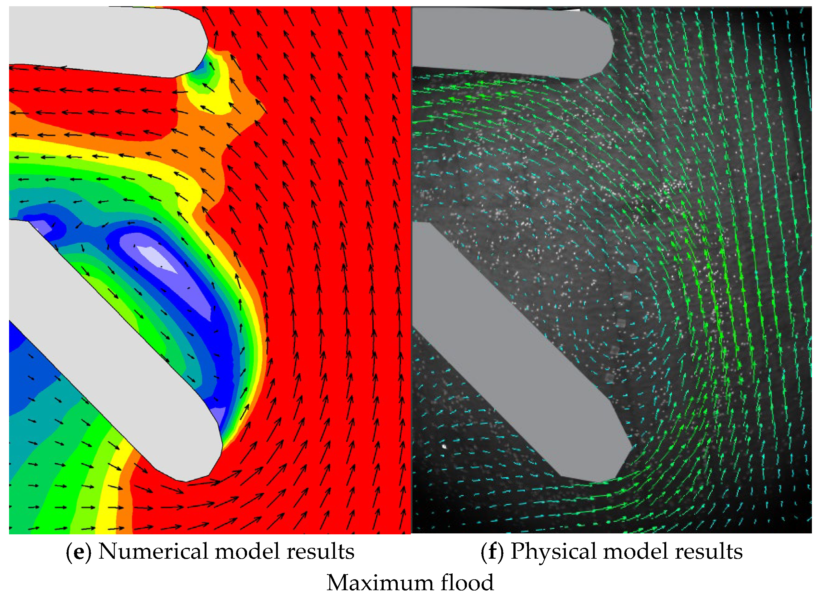 Figure 12a, the northern side of the intake open channel is a straight dike, while the southern dike bends outward by approximately 45° at the entrance. In