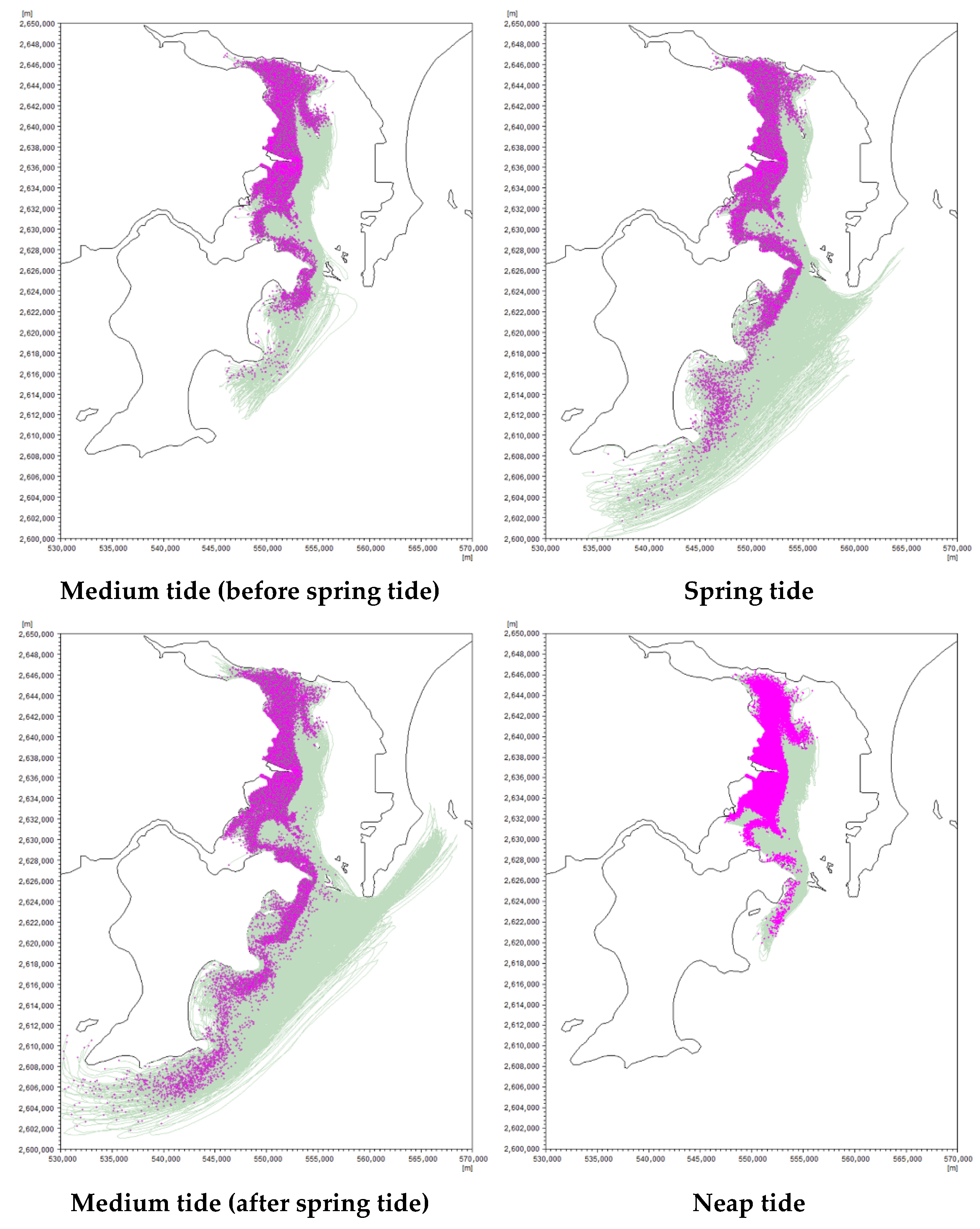 5], based on a hydrodynamic modeling study of the Zhanggang Sea Area in Changle City, applied a particle tracking method to simulate the drift trajectories of