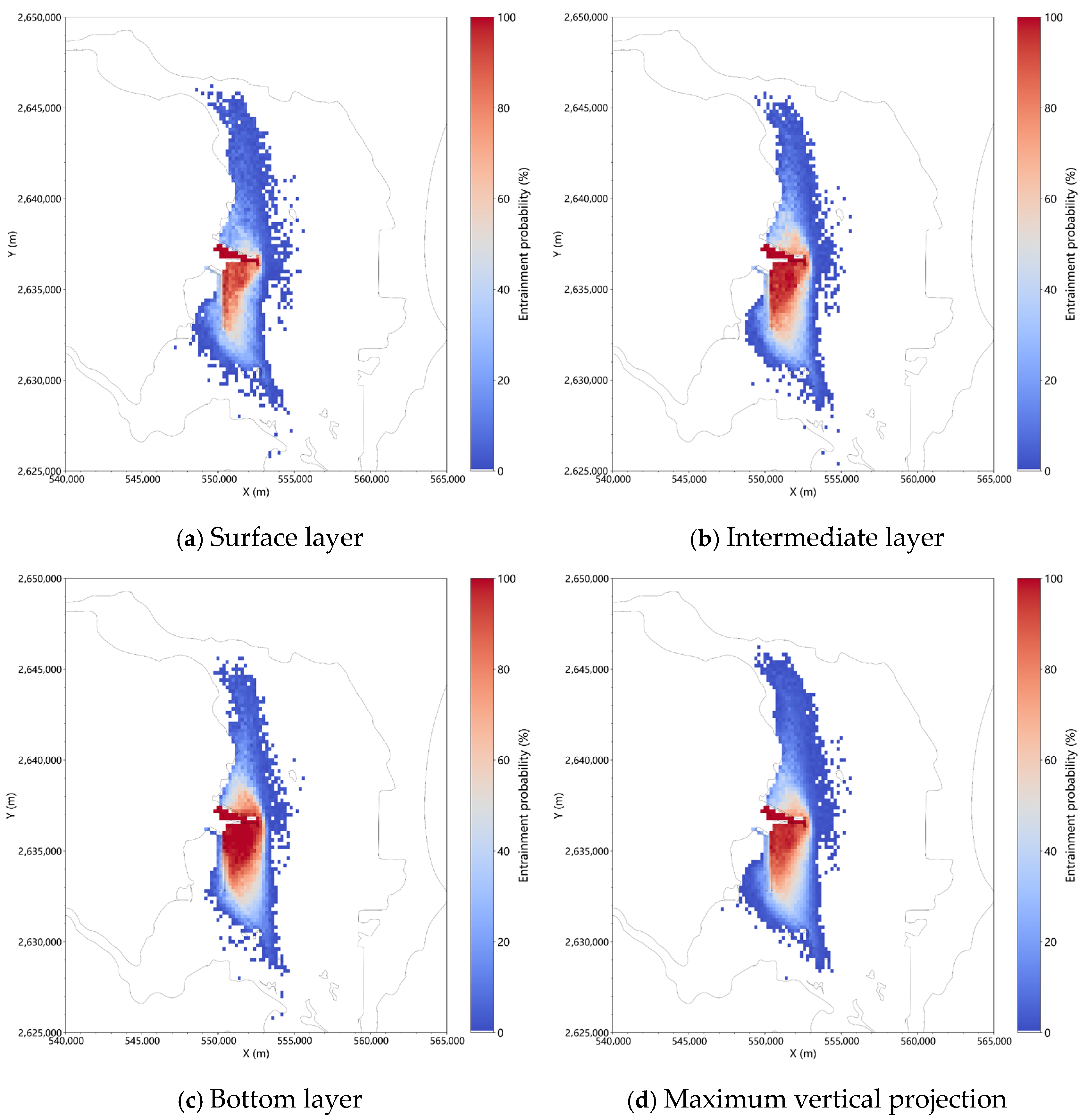 18] analyzed the entrainment probability at a nuclear power plant intake and concluded that intake flow rate, tidal current direction, and water depth significantly influence entrainment risk. Their flow field analysis indicated that water masses within a 1 km radius could potentially enter the intake entrance. He Xiaoqi [