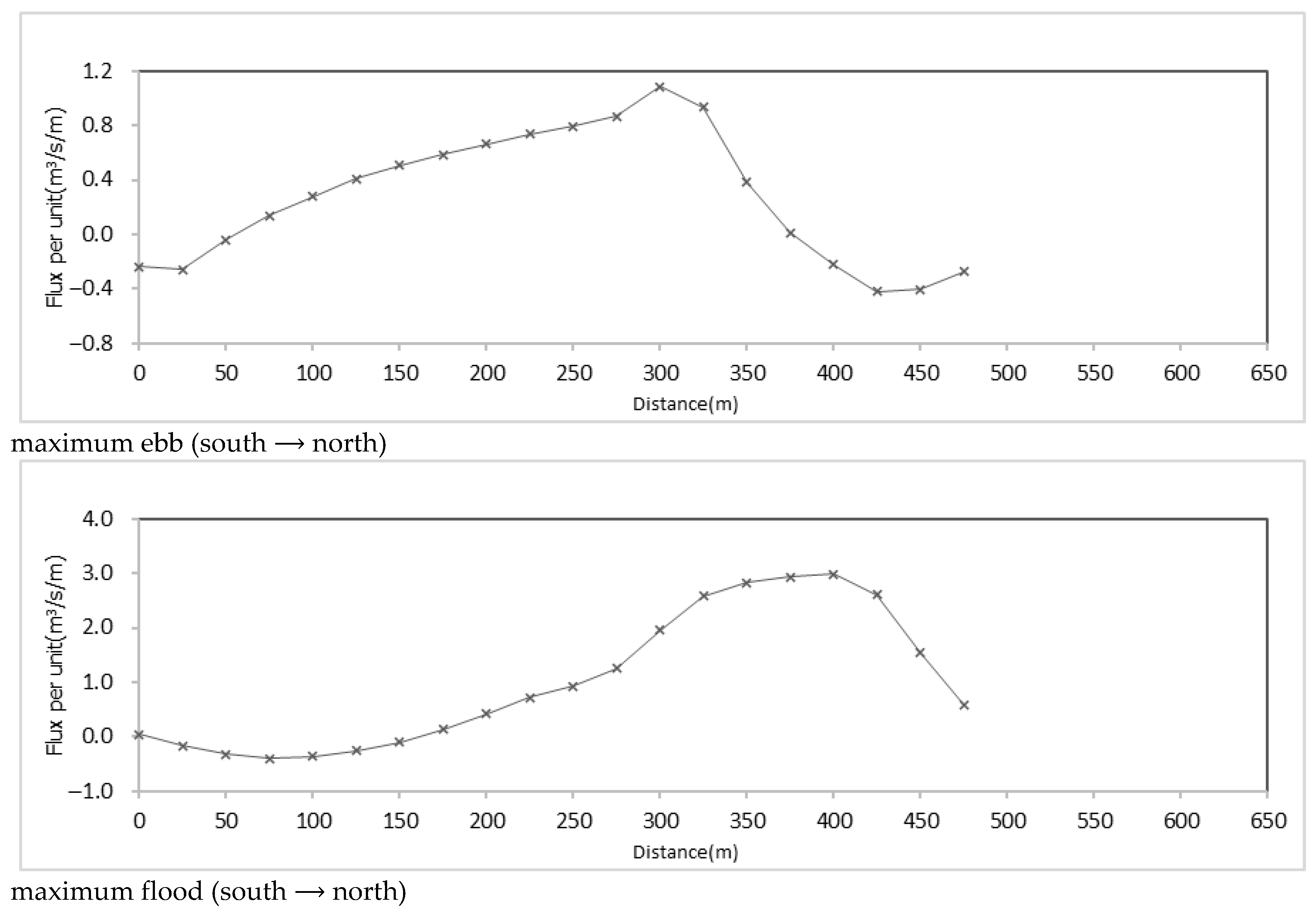 3/s/m located about 320 m from the south breakwater. The lateral opening experiences nearly full cross-section inflow during ebb tide, with a maximum inflow per unit width of 0.8 m