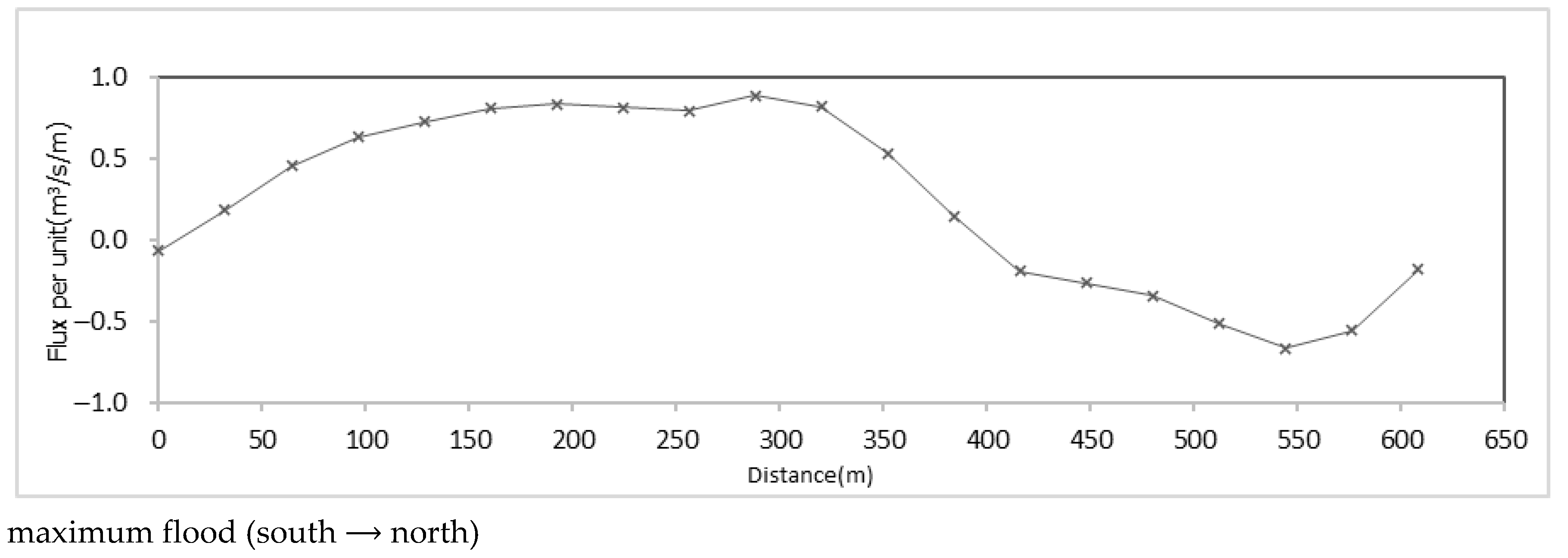 3/s/m on the east side. During flood tide, the west side of the lateral opening exhibits outflow, with a maximum outflow per unit width of 0.4 m