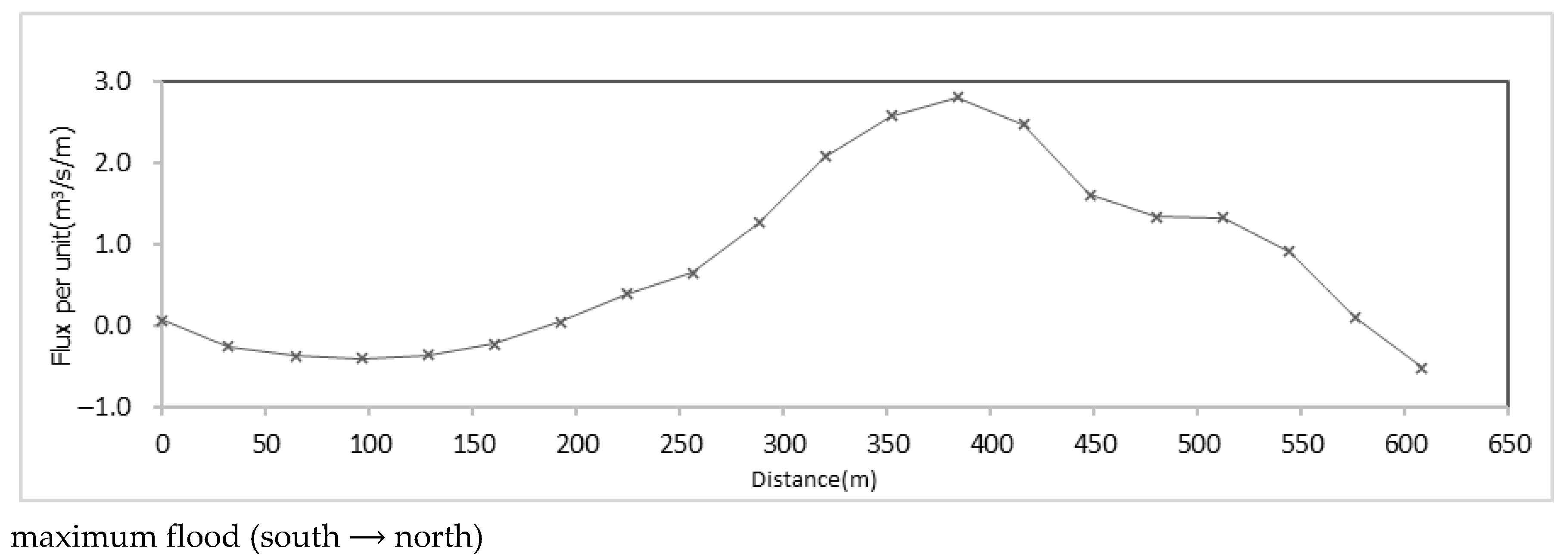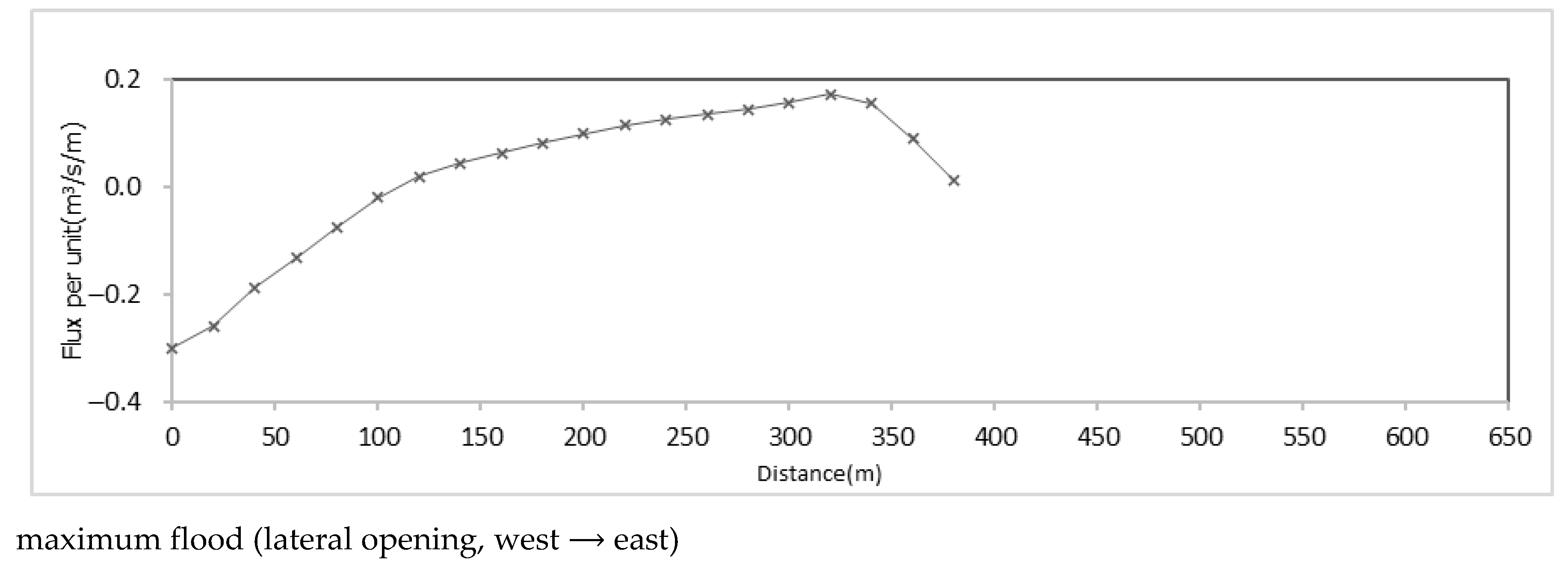 Figure 18. It can be observed that during maximum flood, the three schemes exhibit similar inflow distributions along the original inflow cross-section, with inflow predominantly on the south side. The maximum discharge per unit width at the cross-section is approximately 3 m