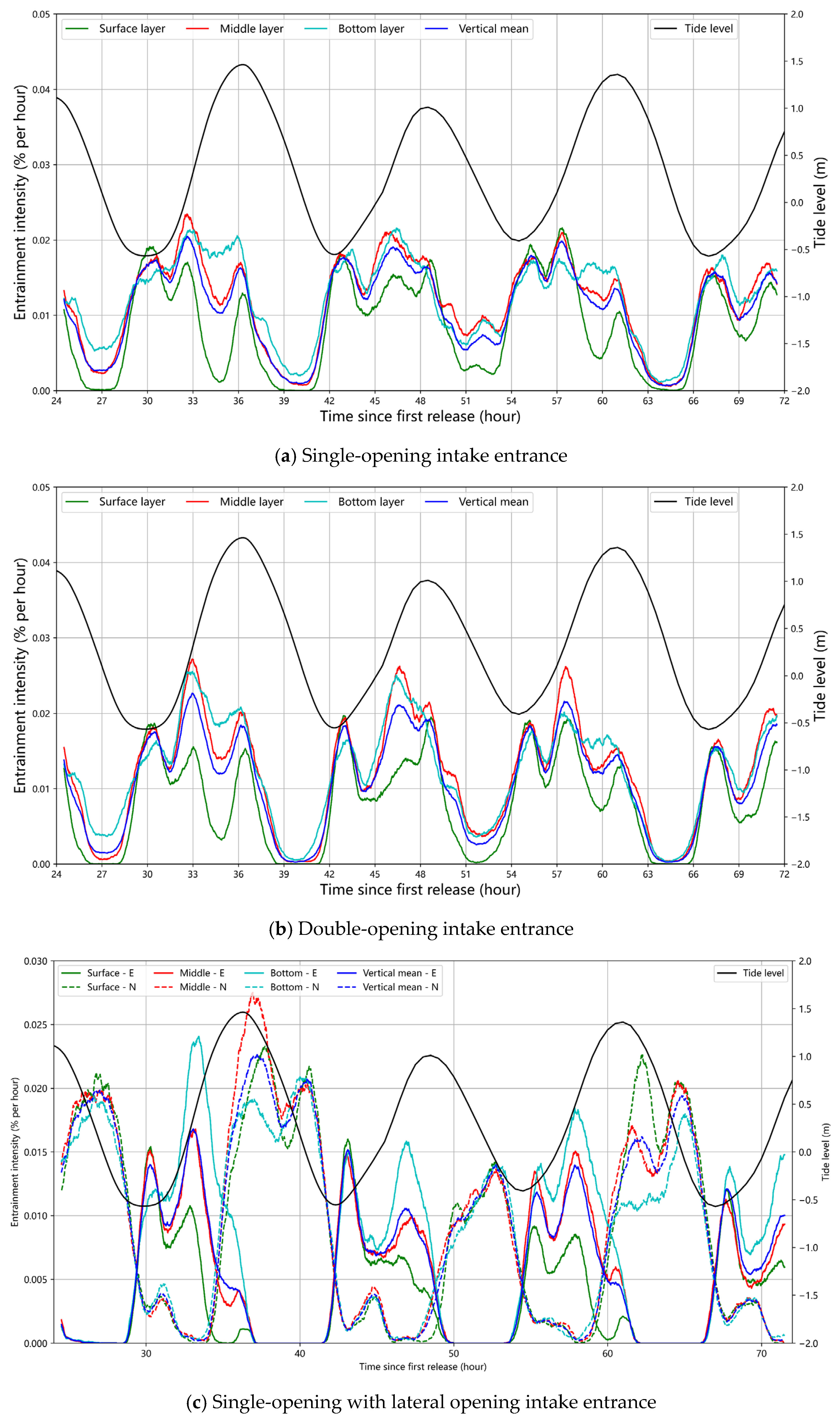 Figure 19. It can be observed that the entrainment intensities of the single-side opening and double-side opening schemes at the intake open channel exhibit little difference, with the maximum entrainment intensity occurring at the early stage of flood tide and the minimum at the late stage of ebb tide. The entrainment intensity during flood tide is higher than that during ebb tide. For the single-side opening combined with lateral opening scheme, the entrainment intensity differs significantly from the former two schemes, showing multiple peaks during both flood and ebb tides, alternately appearing at the east side (original front intake of the open channel) and the north side lateral intake. The entrainment intensity exhibits no significant troughs and is more uniformly distributed over time. From the perspective of layered results, the entrainment intensity of surface layer particles is significantly lower than that of the intermediate and bottom layers.