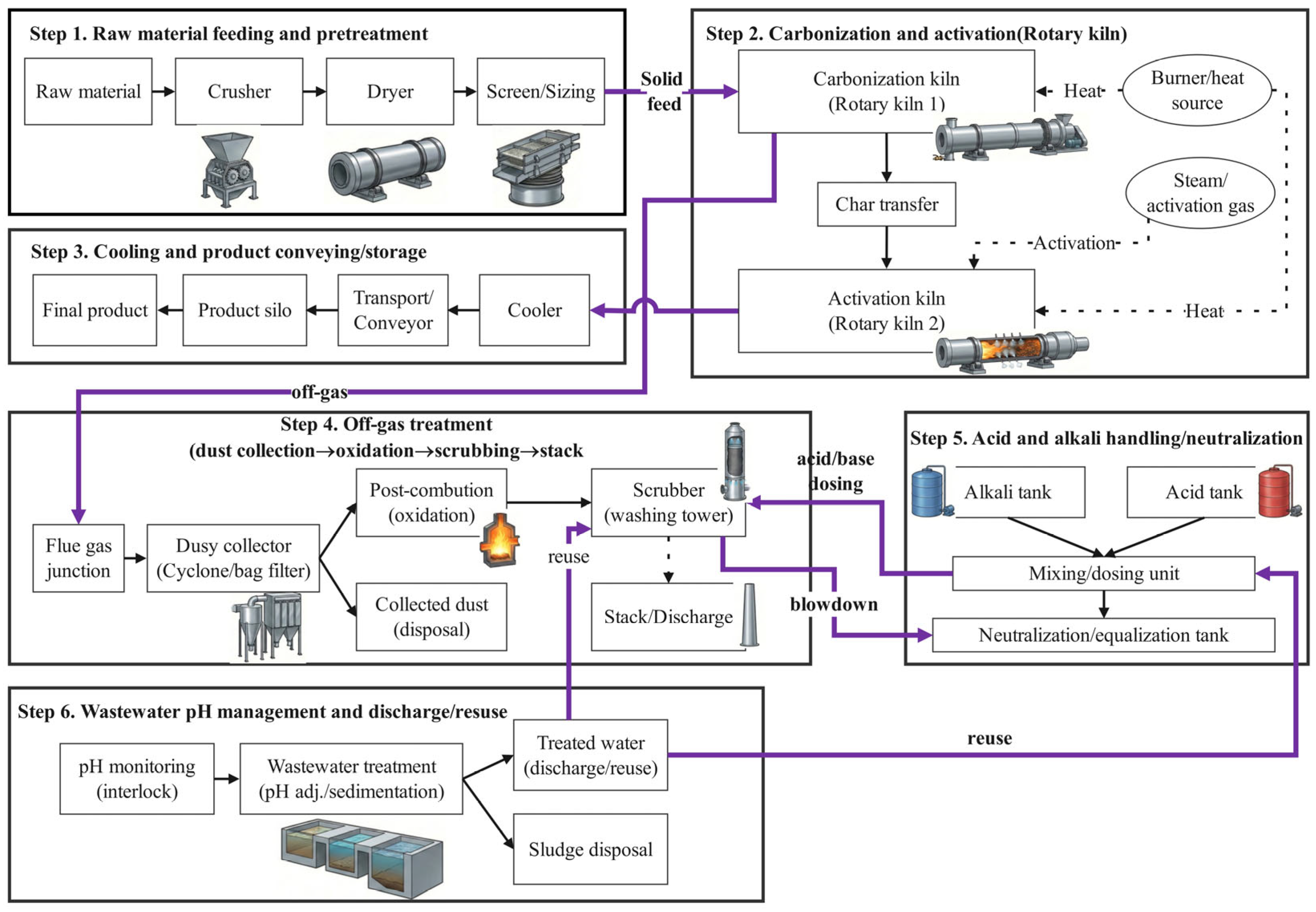 | FM-K2 | Rotary kiln (carbonization/activation) | Temperature control failure | Sensor drift, controller failure | Overheating, thermal runaway, refractory damage | Temperature monitoring, alarms, interlock |