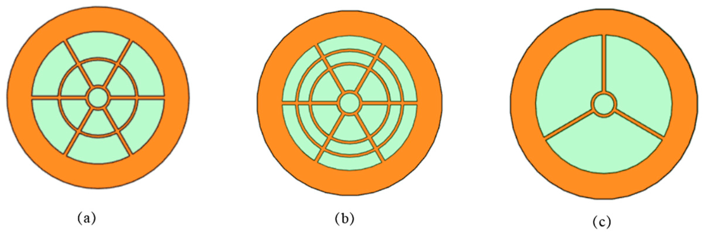 Figure 2. Three fan strut models: (a) hexagonal annular type; (b) hexagonal double-ring type; (c) three-pronged type.