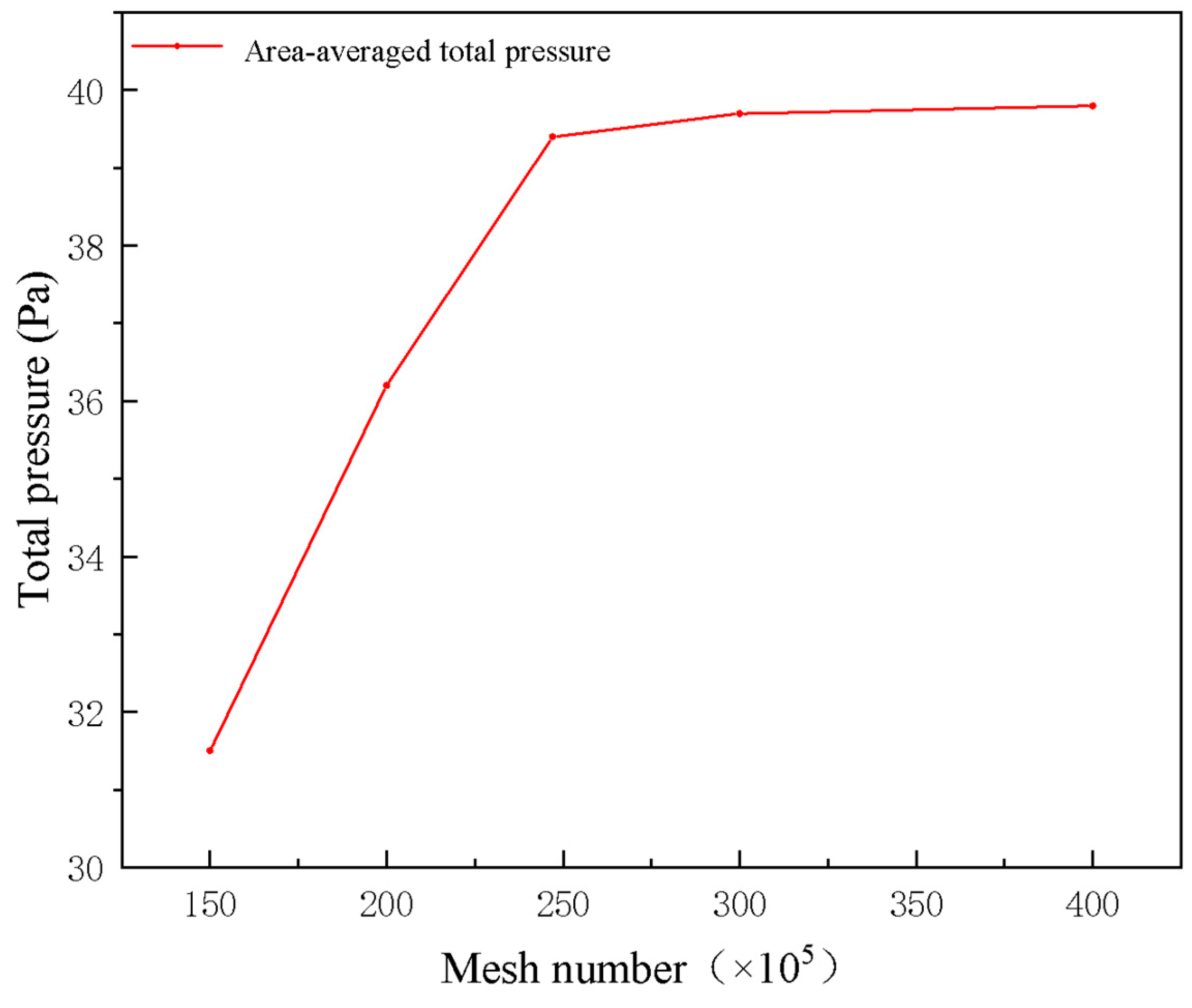 To further assess the adequacy of the LES mesh in critical flow regions, the local resolution quality was examined not only in the blade-tip region, but also near the blade trailing edges, strut leading edges, and the rotor–stator interaction gap. The mesh was designed to ensure sufficient resolution of the dominant unsteady structures in these regions, where wake development, local separation, and pressure fluctuation are most pronounced. In particular, the Pope criterion indicates that approximately 81.2% of the turbulent kinetic energy is resolved in the blade-tip region, and similar fine-resolution treatment was applied to the main interaction zones to satisfy the requirements of the present comparative LES analysis. The overall meshing configuration is presented in Figure 4. To rigorously verify grid independence, a core aerodynamic parameter—the area-averaged total pressure of the fan—was monitored across varying mesh densities. Furthermore, to quantify the numerical uncertainty due to spatial discretization, the Grid Convergence Index (GCI) methodology proposed by Celik et al. [32] was employed. Based on the total pressure values from three consecutive grid sets (coarse: 20.0 million, medium: 24.7 million, fine: 30.0 million), the fine-grid GCI was calculated to be 1.26%. As shown in Figure 5, the area-averaged total pressure converges at approximately 24.7 million elements. Since the GCI value is well below the standard threshold of 3%, the numerical uncertainty is deemed minimal, and the 24.7 million mesh was selected for all subsequent simulations to balance computational accuracy and cost.